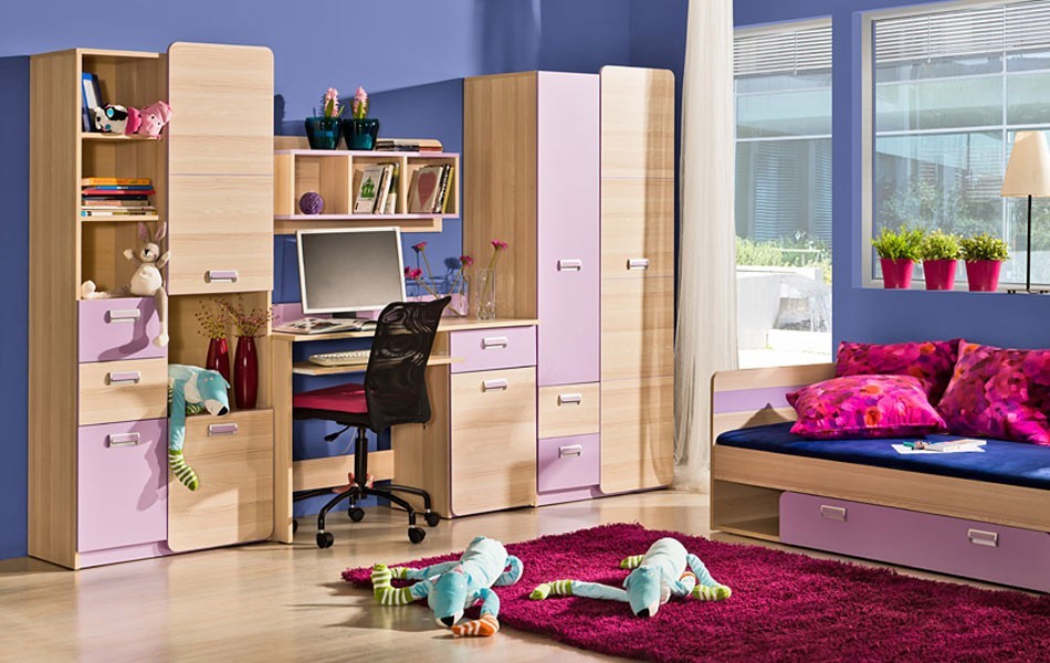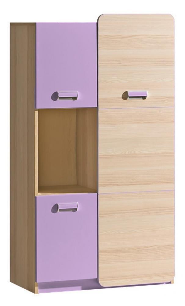 Šatní rohová skříň Lorenzo. Úchyty jsou vyrobeny z plastu. Panty jsou univerzální, můžete si namontovat otvírání na levou i pravou stranu. Barevné provedení je jasan combria a fialová. Dekorace je vytvořena z ABS pásky z PVC výrazné barvy. Skříň obsahuje polici a šatní tyč. Dodáváme v demontovaném stavu.