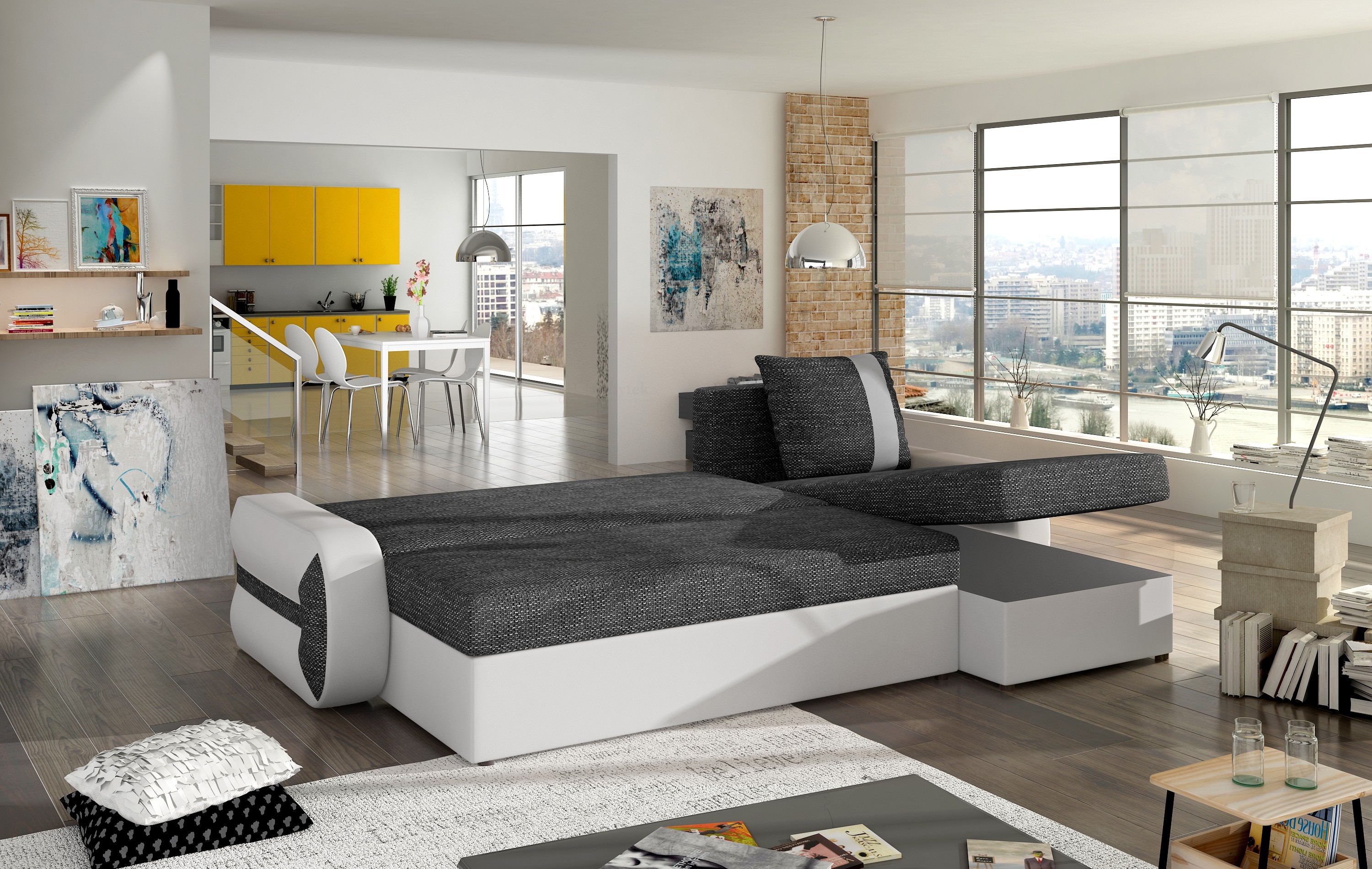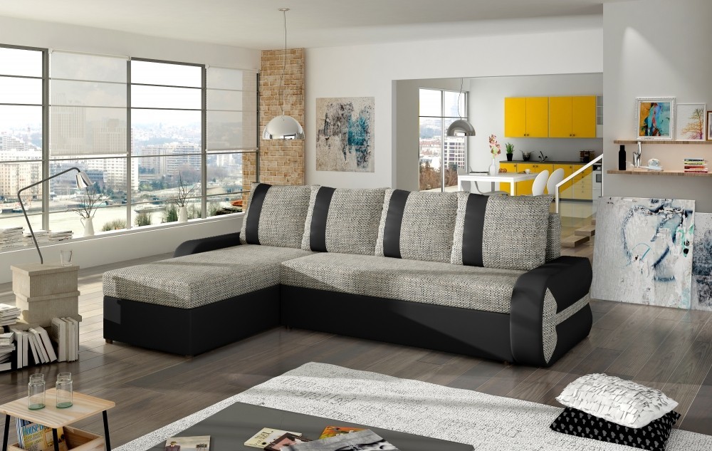 Praktická celočalouněná rohová sedačka Rihana s velmi netradičním a velmi moderním vzhledem. Sedačka obsahuje úložný prostor a prostor pro příležitostné spaní. Po rozložení je spací plocha 203x115cm. Při rozkladu se sedák nadzvedne a přesune dopředu, zadní část se sklopí do vodorovné polohy a polštáře se odejmou. Sedačka je navíc univerzální, dá se složit na obě strany. Sedačka je čalouněna látkou Berlin 02 a ekokůží Madryt 1100. V nabídce je spoustu dalších barevných variant.