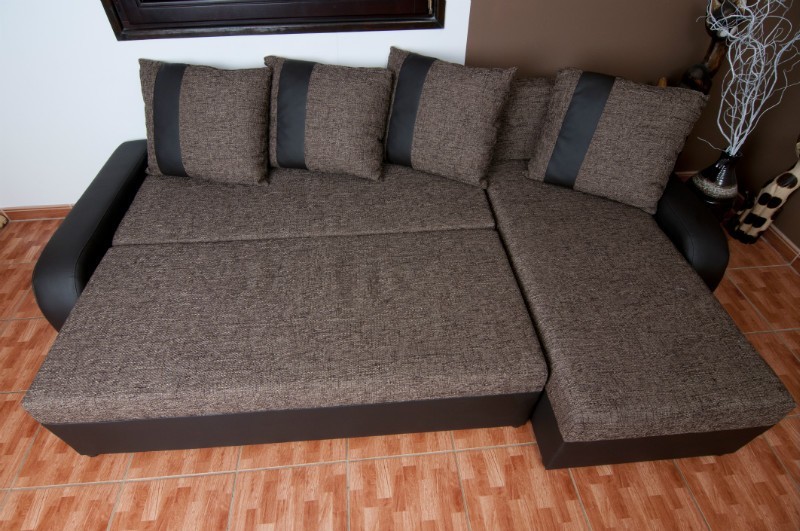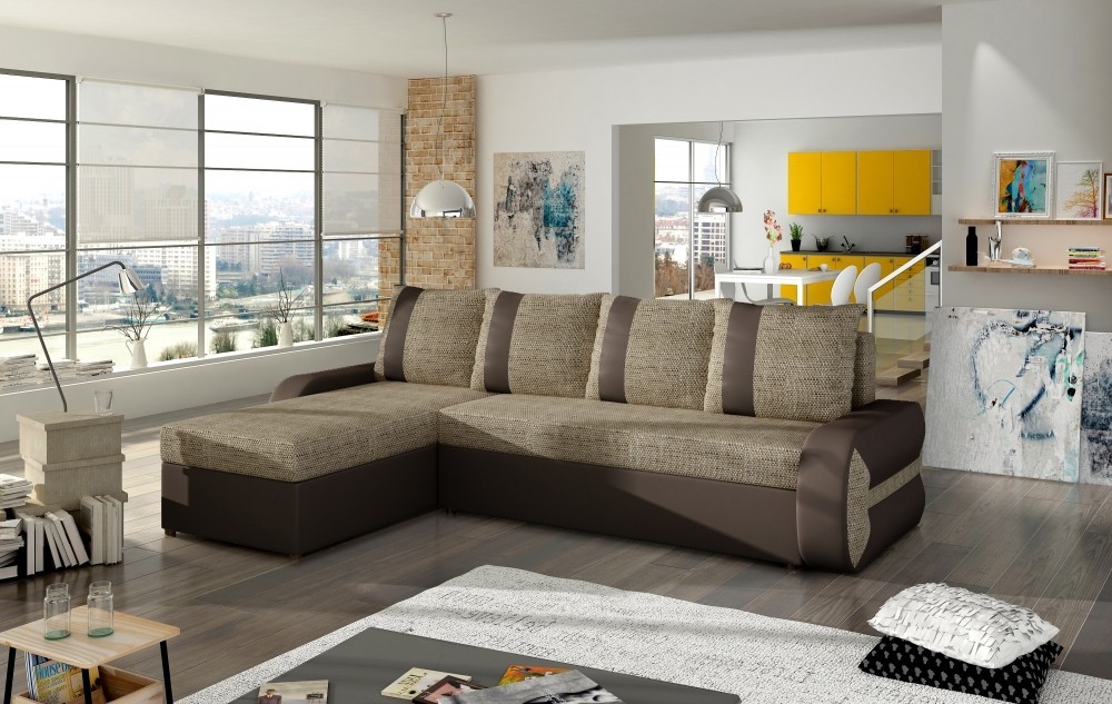 Praktická celočalouněná rohová sedačka Rihana s velmi netradičním a velmi moderním vzhledem. Sedačka obsahuje úložný prostor a prostor pro příležitostné spaní. Po rozložení je spací plocha 203x115cm. Při rozkladu se sedák nadzvedne a přesune dopředu, zadní část se sklopí do vodorovné polohy a polštáře se odejmou. Sedačka je navíc univerzální, dá se složit na obě strany. Sedačka je čalouněna látkou Berlin 03 a ekokůží Madryt 128. V nabídce je spoustu dalších barevných variant.