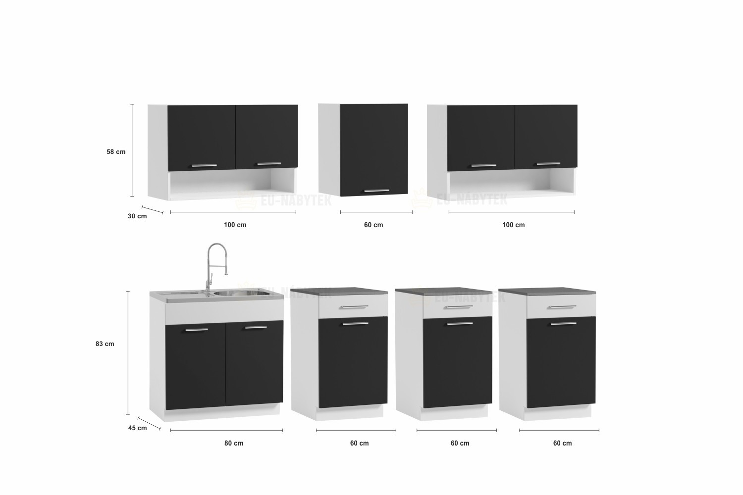 Luxusní kuchyně vhodná i do panelákových bytů. Tato kuchyně je navržena tak, že skříňky se dají poskládat v libovolném pořadí. To vám umožní si sestavit kuchyni podle svých představ. Pracovní deska je v barvě grafit, která je dodávána vcelku 180cm (kromě skříňky na dřez). Sokl i korpus jsou v bílé barvě. Spodní i horní dvířka jsou v červené barvě v lesku. Sestava se skládá ze spodních skříněk - výška 82, hloubka 45, šířka 80/60/60/60 cm a vrchních skříněk - výška 58, hloubka 30, šířka 100/60/100 cm. Úchyty jsou plastové a mají šedou barvu. Pracovní deska je v ceně. Spotřebiče, dřez a digestoř v ceně nejsou. Kuchyň nabízíme také v dalších barevných variantách - dole na této stránce. Možnost doobjednání dřezu. Dodáváme v demontovaném stavu.