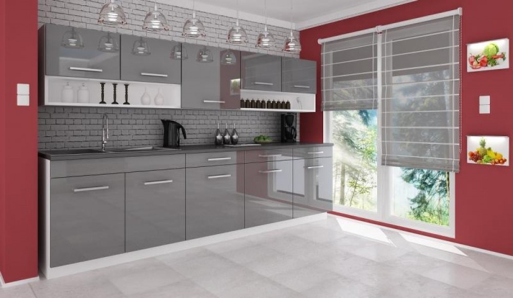 Luxusní kuchyně vhodná i do panelákových bytů. Tato kuchyně je navržena tak, že skříňky se dají poskládat v libovolném pořadí. To vám umožní si sestavit kuchyni podle svých představ. Pracovní deska je v barvě grafit, která je dodávána vcelku 180cm (kromě skříňky na dřez). Sokl i korpus jsou v bílé barvě. Spodní i horní dvířka jsou v šedé barvě v lesku. Sestava se skládá ze spodních skříněk - výška 82, hloubka 45, šířka 80/60/60/60 cm a vrchních skříněk - výška 58, hloubka 30, šířka 100/60/100 cm. Úchyty jsou plastové a mají šedou barvu. Pracovní deska je v ceně. Spotřebiče, dřez a digestoř v ceně nejsou. Kuchyň nabízíme také v dalších barevných variantách - dole na této stránce. Možnost doobjednání dřezu. Dodáváme v demontovaném stavu.