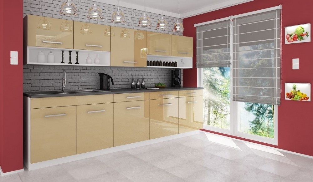 Luxusní kuchyně vhodná i do panelákových bytů. Tato kuchyně je navržena tak, že skříňky se dají poskládat v libovolném pořadí. To vám umožní si sestavit kuchyni podle svých představ. Pracovní deska je v barvě grafit, která je dodávána vcelku 180cm (kromě skříňky na dřez). Sokl i korpus jsou v bílé barvě. Spodní i horní dvířka jsou ve zlaté barvě v lesku. Sestava se skládá ze spodních skříněk - výška 82, hloubka 45, šířka 80/60/60/60 cm a vrchních skříněk - výška 58, hloubka 30, šířka 100/60/100 cm. Úchyty jsou plastové a mají šedou barvu. Pracovní deska je v ceně. Spotřebiče, dřez a digestoř v ceně nejsou. Možnost doobjednání dřezu. Dodáváme v demontovaném stavu.