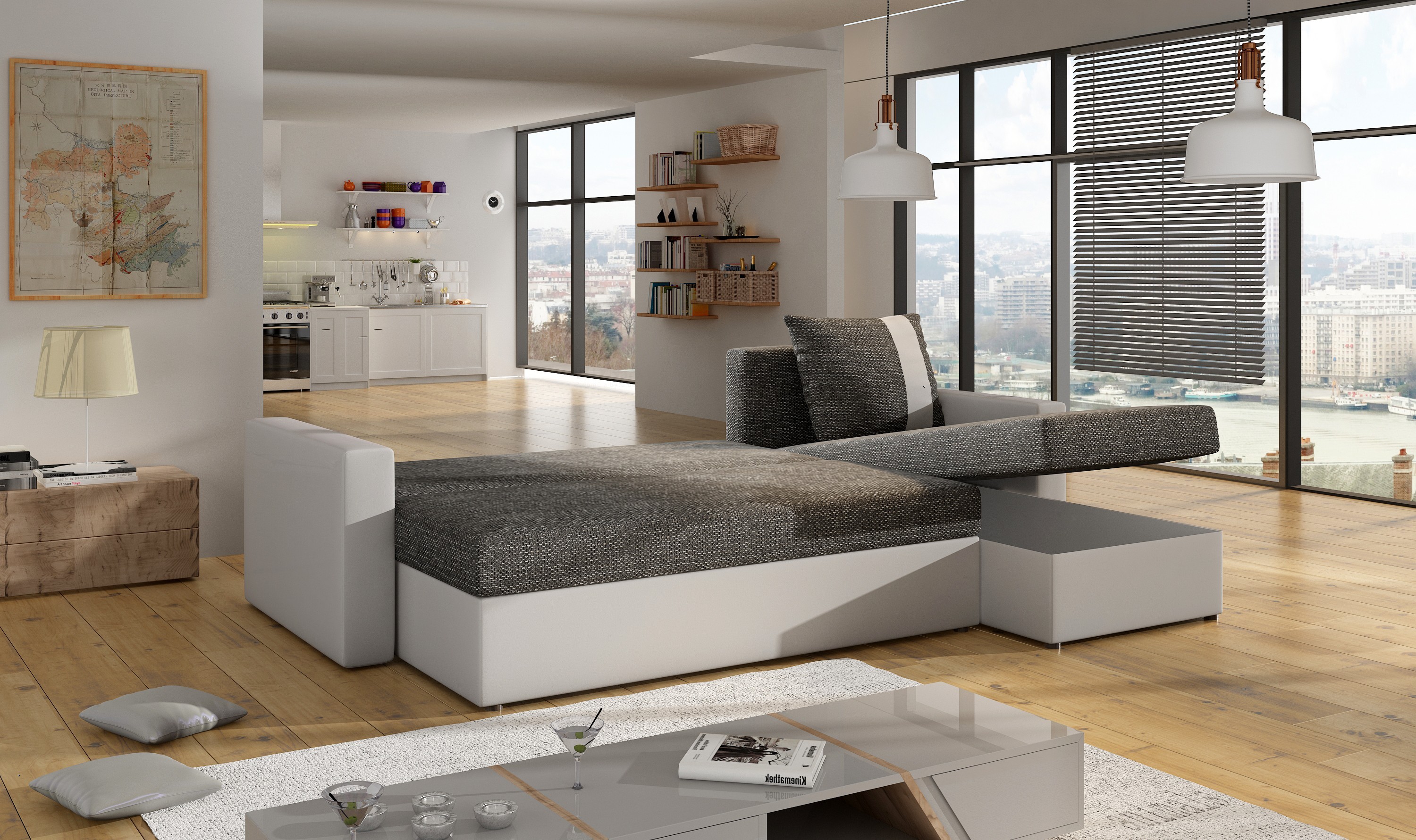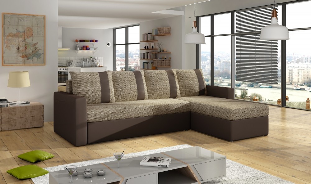 Praktická celočalouněná rohová sedačka s netradičním a velmi moderním vzhledem. Díky kvalitním pružinám Faliste a vysokoelastické pěně T30 si dopřejete pohodlné posezení. Sedačka obsahuje praktický úložný prostor a prostor na příležitostné spaní. Po rozložení získáte spací plochu o rozměru 115x203cm. Při rozkladu se sedák nadzvedne a přesune dopředu, zadní část se sklopí do vodorovné polohy a polštáře oddělají. Čalouněná je látkou Berlin 02 a ekokůží Madryt 120. V nabídce i v jiných barevných kombinacích. Lze zakoupit také taburet.