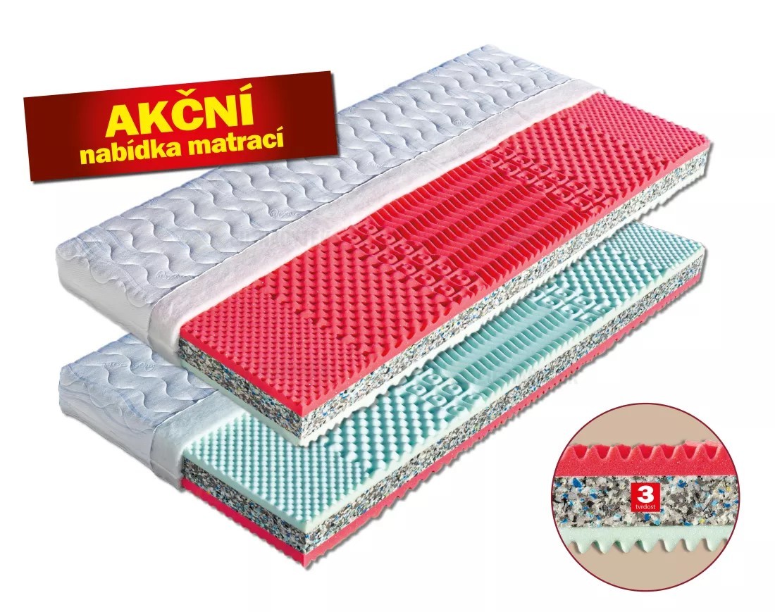 Sendvičová matrace s jádrem z pojeného polyuretanu (PUR RE 80) ve výšce 7 cm. Vrchní stranu matrace tvoří elastická antibakteriální pěna tvarovaná do nopů s úpravou Sanitized (32 kg/m³). Poskytuje trvalou a účinnou ochranu proti bakteriím, roztočům a plísním. Druhou stranu tvoří tvrdší pěna MediFoam (32 kg/m³), taktéž tvarovaná do masážních nopů. Matrace je určená pro širokou škálu uživatelů a je vhodná na všechny typy roštů. Celková výška matrace cca 16 cm.
