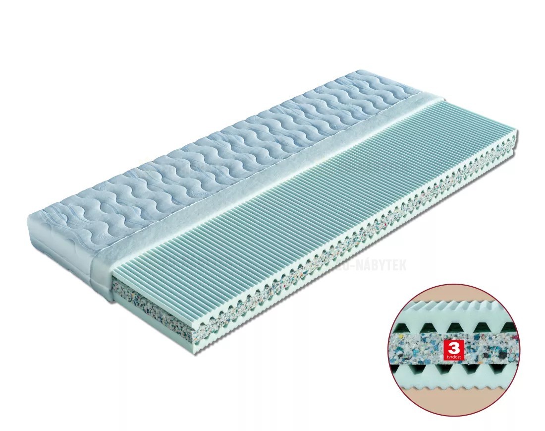Matrace je vyrobena z pevného pojeného jádra (PUR RE 80) a profilované pěny MediFoam (32 kg/m³). Podélné oboustranné tvarování nosných vrstev zajišťuje dokonalé odvětrávání a regulaci vlhkosti. Provzdušnění prostoru mezi povrchem matrace a potahovou látkou zaručuje kanálkové tvarování povrchu matrace. Matrace je vhodná pro všechny typy roštů. Celková výška matrace cca 15 cm.