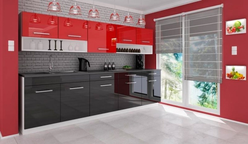 Luxusní kuchyně vhodná i do panelákových bytů. Tato kuchyně je navržena tak, že skříňky se dají poskládat v libovolném pořadí. To Vám umožní si sestavit kuchyni podle svých představ. Pracovní deska je v barvě grafit, která je dodávána vcelku 180cm (kromě skříňky na dřez). Sokl i korpus jsou v bílé barvě. Spodní i horní dvířka jsou v černé a červené barvě v lesku. Sestava se skládá ze spodních skříněk - výška 82, hloubka 45, šířka 80/60/60/60 cm a vrchních skříněk - výška 58, hloubka 30, šířka 100/60/100 cm. Úchyty jsou plastové a mají šedou barvu. Pracovní deska je v ceně. Spotřebiče, dřez a digestoř v ceně nejsou. Kuchyň nabízíme také v dalších barevných variantách. Možnost doobjednání dřezu. Dodáváme v demontovaném stavu.