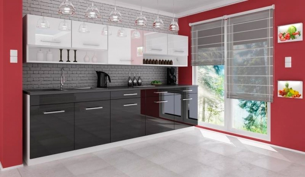 Luxusní kuchyně vhodná i do panelákových bytů. Tato kuchyně je navržena tak, že skříňky se dají poskládat v libovolném pořadí. To Vám umožní si sestavit kuchyni podle svých představ. Pracovní deska je v barvě grafit, která je dodávána vcelku 180cm (kromě skříňky na dřez). Sokl i korpus jsou v bílé barvě. Spodní i horní dvířka jsou v černé a bílé barvě v lesku. Sestava se skládá ze spodních skříněk - výška 82, hloubka 45, šířka 80/60/60/60 cm a vrchních skříněk - výška 58, hloubka 30, šířka 100/60/100 cm. Úchyty jsou plastové a mají šedou barvu. Pracovní deska je v ceně. Spotřebiče, dřez a digestoř v ceně nejsou. Kuchyň nabízíme také v dalších barevných variantách. Možnost doobjednání dřezu. Dodáváme v demontovaném stavu.