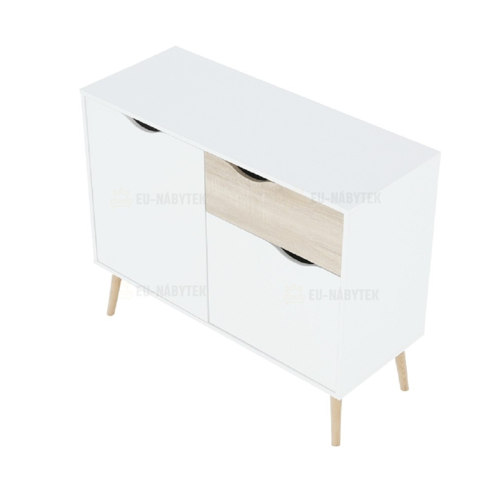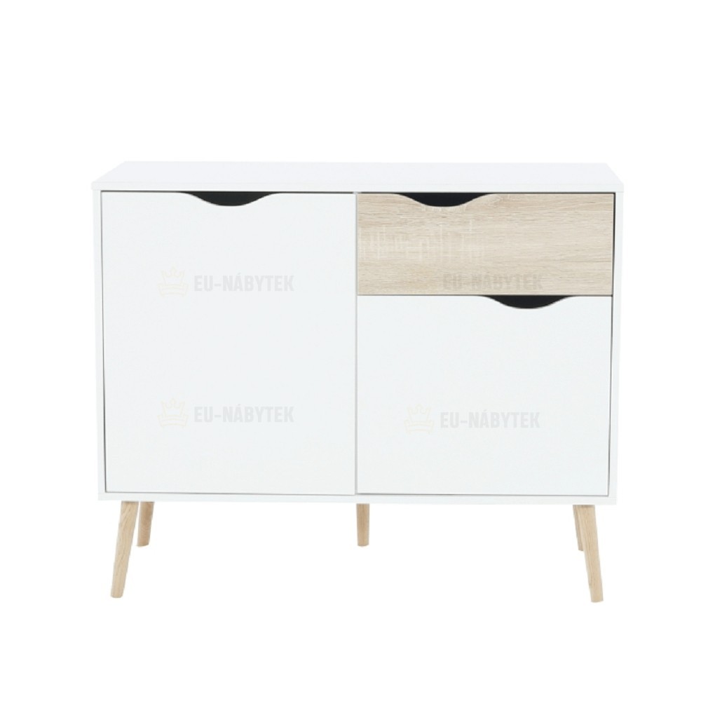 komoda 75387 Materiál: DTD laminovaná Provedení: dub sonoma / bílá Rozměry (ŠxHxV): 98,1x39,1x81 cm dvoje dvířek čtyři poličky šuplík Tloušťka materiálu: 1,6 cm Výška nohou: 15 cm Dodávané v demontu