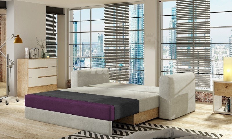 Elegantní rozkládací pohovka WAPER s úložným prostorem a rozkladem pro příležitostné spaní. Po rozložení vznikne plocha na spaní 125 x 200 cm. Netradiční barvy i futuristický design dodají interiéru velmi moderní vzhled. Součástí pohovky jsou i dva praktické polštáře. Provedení v látkách Nubuk 132 a 16.
