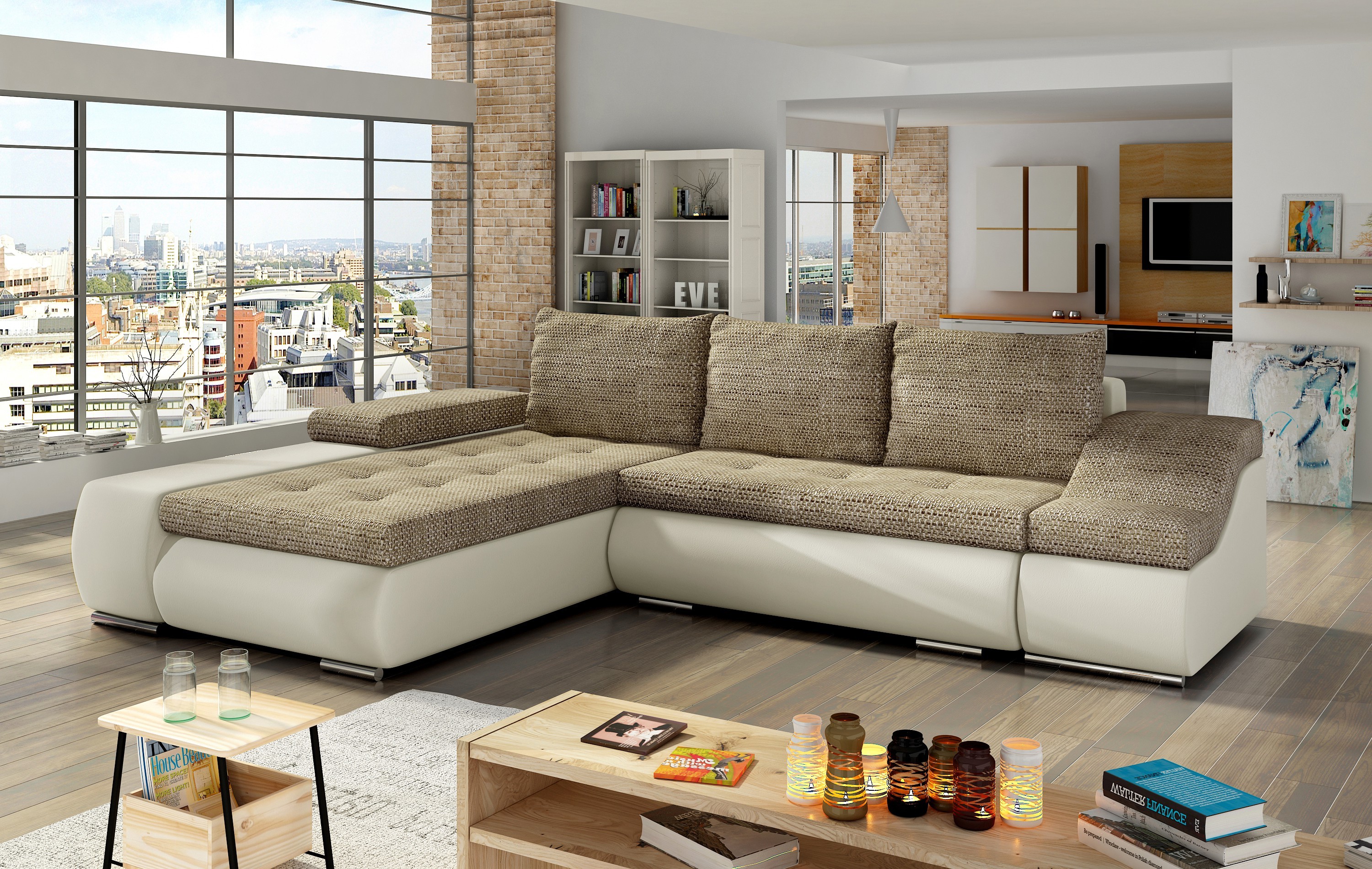 Netradiční rohová sedačka TORONTO s úložným prostorem a rozkladem pro příležitostné spaní. Po rozložení vzniká plocha na spaní 225 x 122 cm. Pohodlné sezení vám zaručí kvalitní pružiny Faliste a vysokoelastická pěna T30. Nadchne především zajímavou designovou područkou a kovovými stříbrnými nožkami. Barevné provedení - Berlin 03 a béžová ekokůže Soft 33. Dodávano v demontu, 4 ks. V nabídce i jiné barevné kombinace.