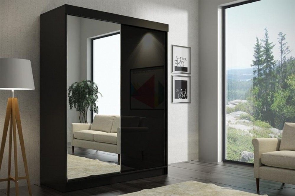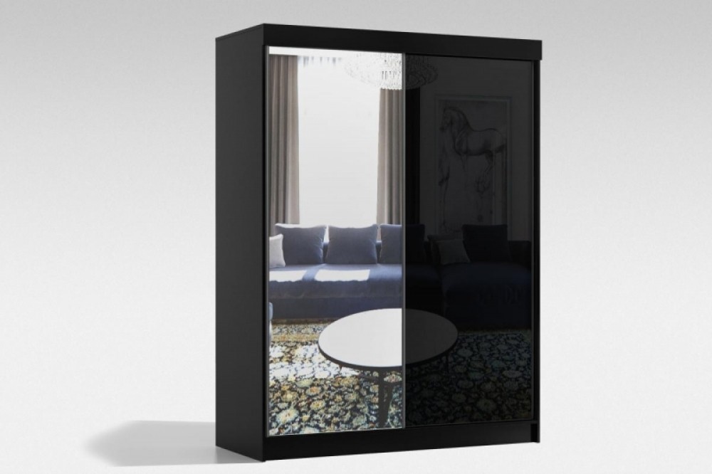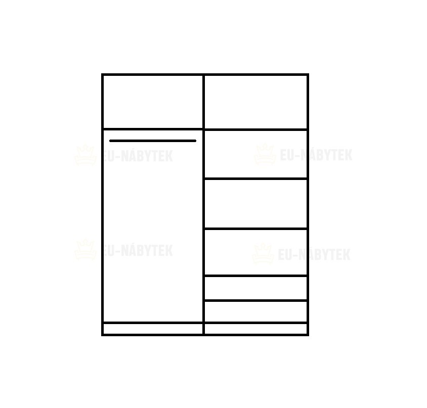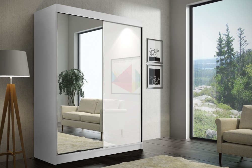 Šatní skříň s posuvnými dveřmi v moderním provedení. Korpus i dvířka jsou z kvalitního LTD a barevné provedení je korpus bílý mat a dvířka bílý lesk. Skříň obsahuje praktické zrcadlo. Uspořádání polic viz. perokresba. Skříň disponuje 2 šuplíky. Dodáváme v demontovaném stavu.