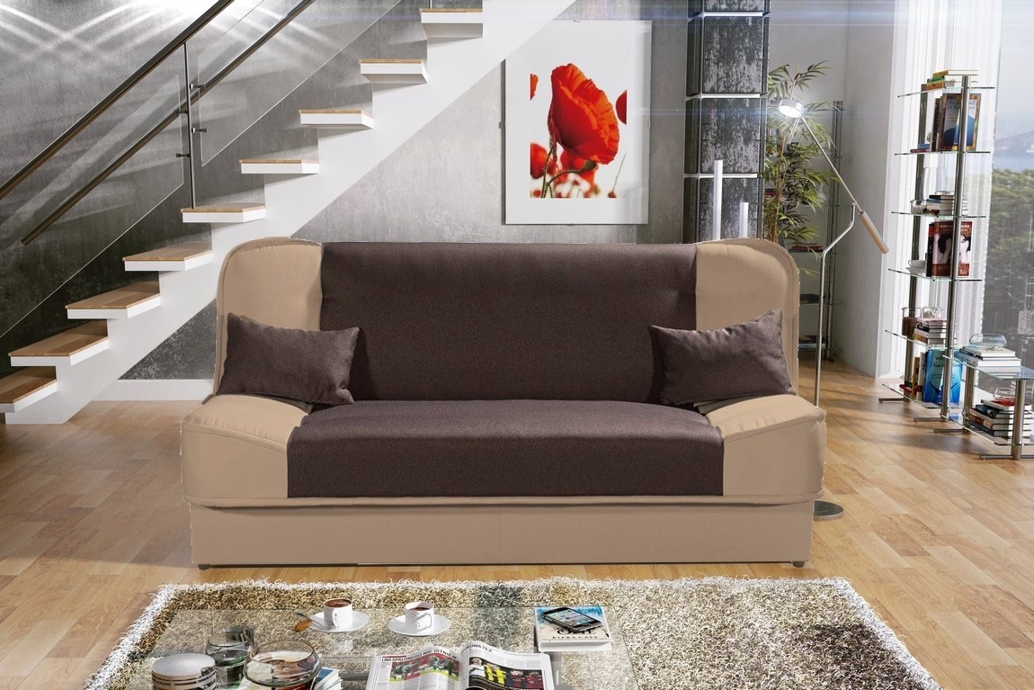 Pohovka Jasmín se rozkládá povytažením přední části a sklopením zadní části do vodorovné polohy. Spací plocha po rozložení je 194x117cm. Výška sedu je 40 cm, hloubka sedu 56cm. Obsahuje také praktický úložný prostor, který se nachází pod sedákem. Polštáře jsou v ceně pohovky. Pohodlné sezení zaručují bonell pružiny spolu s PUR pěnou. Nožky jsou z plastu. Pohovka je vhodná jak do obývacího pokoje tak například i pokoje pro hosty. Foto je ilustrační, vzor na potahové látce může být posunutý. Čalouněná je látkou Alova 68 a Alova 66.