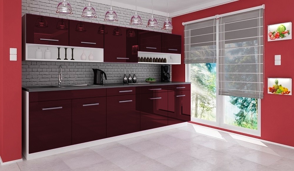Luxusní kuchyně vhodná i do panelákových bytů. Tato kuchyně je navržena tak, že skříňky se dají poskládat v libovolném pořadí. To Vám umožní si sestavit kuchyni podle svých představ. Pracovní deska je v barvě grafit, která je dodávána vcelku 180cm (kromě skříňky na dřez). Sokl i korpus jsou v bílé barvě. Spodní i horní dvířka jsou v bordo barvě v lesku. Sestava se skládá ze spodních skříněk - výška 82, hloubka 45, šířka 80/60/60/60 cm a vrchních skříněk - výška 58, hloubka 30, šířka 100/60/100 cm. Úchyty jsou plastové a mají šedou barvu. Pracovní deska je v ceně. Spotřebiče, dřez a digestoř v ceně nejsou. Kuchyň nabízíme také v dalších barevných variantách. Možnost doobjednání dřezu. Dodáváme v demontovaném stavu. Dvířka jsou v lesku.