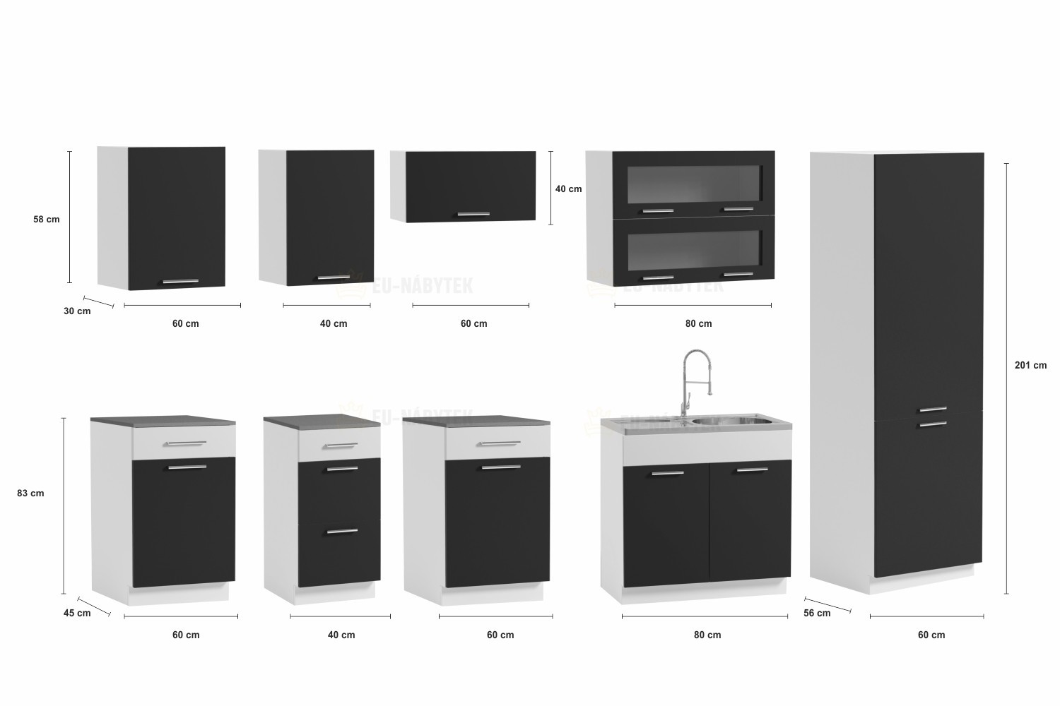 Luxusní kuchyně vhodná i do panelákových bytů. Tato kuchyně je navržena tak, že skříňky se dají poskládat v libovolném pořadí. To vám umožní si sestavit kuchyni podle svých představ. Pracovní deska je v ceně v barvě grafit, která je dodávána vcelku 160cm. Sokl i korpus jsou v bílé barvě. Sestava se skládá ze spodních skříněk - výška 82, hloubka 45, šířka 60/40/60/80 cm, potravinová skříň výška 201 cm, hloubka 55 cm, šířka 60 cm a vrchních skříněk - výška 58, hloubka 30, šířka 60/40/60/80 cm. Úchyty jsou plastové a mají šedou barvu. Spotřebiče, dřez a digestoř v ceně nejsou. Kuchyň nabízíme také v dalších barevných variantách - dole na této stránce. Možnost doobjednání dřezu. Dodáváme v demontovaném stavu. Dvířka i dekorační pruh jsou v lesku, níže si prosím zvolte barvu.