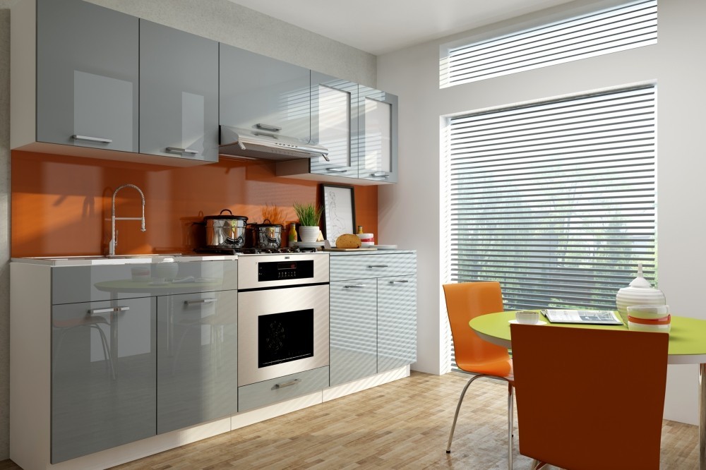 Luxusní kuchyně vhodná i do panelákových bytů. Tato kuchyně je navržena tak, že skříňky se dají poskládat v libovolném pořadí. To Vám umožní si sestavit kuchyni podle svých představ. Pracovní deska je v ceně v barvě grafit, která je dodávána vcelku (80 cm). Sokl i korpus jsou v bílé barvě. Sestava se skládá ze spodních skříněk - výška 82, hloubka 45, šířka 80/60/80 cm a vrchních skříněk - výška 58, hloubka 30, šířka 80/60/80 cm. Úchyty jsou plastové a mají šedou barvu. Spotřebiče, dřez a digestoř v ceně nejsou. Možnost doobjednání dřezu. Dodáváme v demontovaném stavu. Dvířka jsou v šedém lesku.