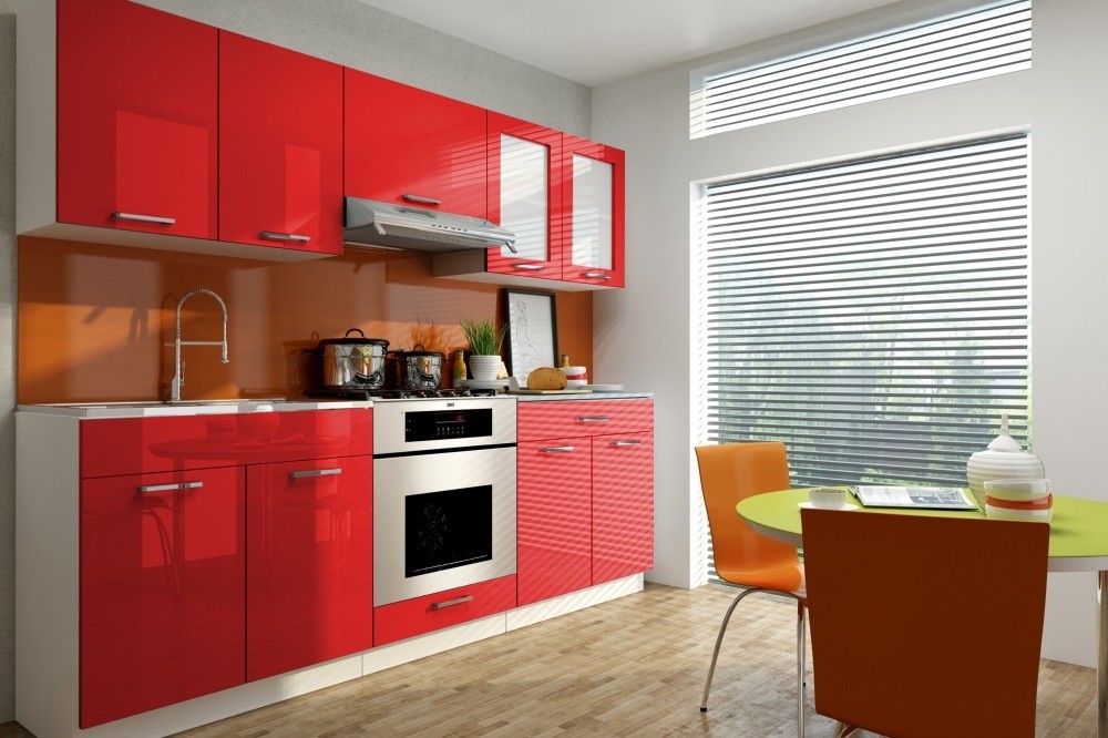 Luxusní kuchyně vhodná i do panelákových bytů. Tato kuchyně je navržena tak, že skříňky se dají poskládat v libovolném pořadí. To vám umožní si sestavit kuchyni podle svých představ. Pracovní deska je v ceně v barvě grafit, která je dodávána vcelku (80 cm). Sokl i korpus jsou v bílé barvě. Sestava se skládá ze spodních skříněk - výška 82, hloubka 45, šířka 80/60/80 cm a vrchních skříněk - výška 58, hloubka 30, šířka 80/60/80 cm. Úchyty jsou plastové a mají šedou barvu. Spotřebiče, dřez a digestoř v ceně nejsou. Možnost doobjednání dřezu. Dodáváme v demontovaném stavu. Dvířka jsou v červeném lesku.