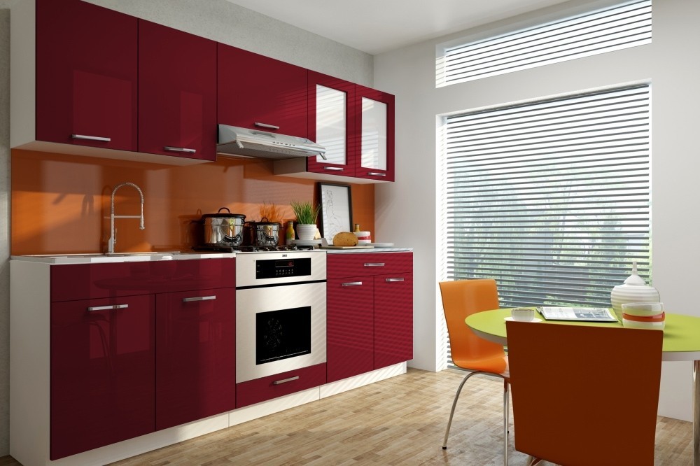 Luxusní kuchyně vhodná i do panelákových bytů. Tato kuchyně je navržena tak, že skříňky se dají poskládat v libovolném pořadí. To vám umožní si sestavit kuchyni podle svých představ. Pracovní deska je v ceně v barvě grafit, která je dodávána vcelku (80 cm). Sokl i korpus jsou v bílé barvě. Sestava se skládá ze spodních skříněk - výška 82, hloubka 45, šířka 80/60/80 cm a vrchních skříněk - výška 58, hloubka 30, šířka 80/60/80 cm. Úchyty jsou plastové a mají šedou barvu. Spotřebiče, dřez a digestoř v ceně nejsou. Možnost doobjednání dřezu. Dodáváme v demontovaném stavu. Dvířka jsou v lesku bordó.