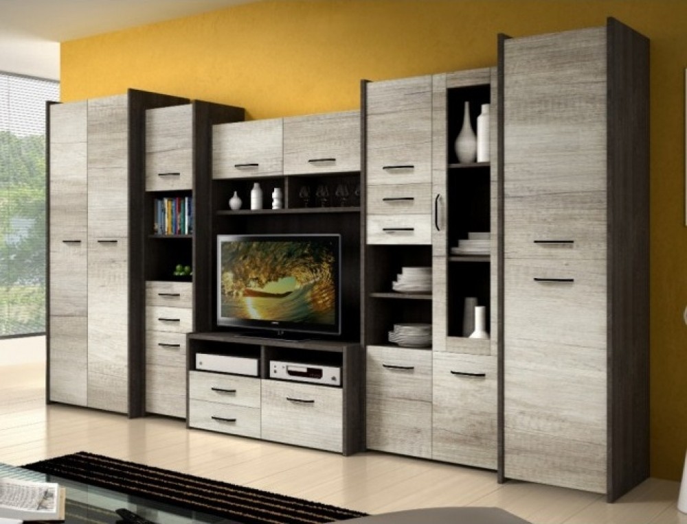 Obývací stěna MOCCA II je od tohoto výrobce velmi zdařilá. Svou různorodou hloubkou nábytku, působí jak vlna moře ženoucí se místností. Barevná kombinace je velmi moderní, ojedinělá a oku lahodící. Výrobce použil barvu korpusu v dubu centrbury a přední části v dubu country grey, doladil i úchyty do barvy korpusu, které jsou jemné a nenásilné. Je zde dbáno na pestré využití úložných prostor.Rozměry jsou (šxvxh) skříň 79x200x53cm, regál 44x190x45cm, panel RTV 109x180x53cm, vitrína 79x190x40cm, skříň 49x200x53cm. Nechybí ani prosklená část. Dodávano v demontu.