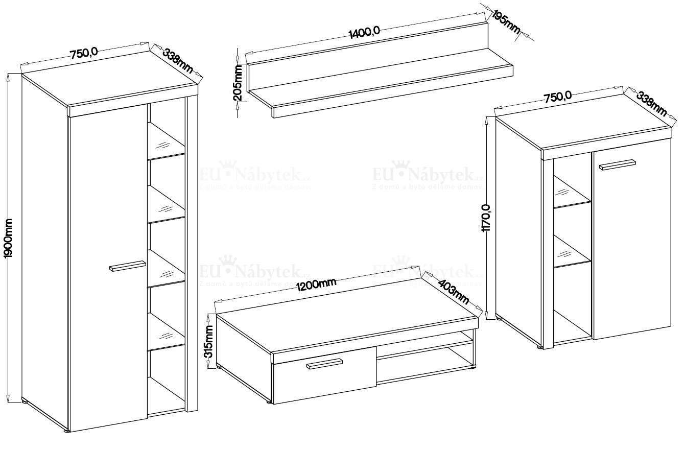 Skříň: šířka: 75 cm, hloubka: 34 cm, výška: 190 cm TV stolek: šířka: 120 cm, hloubka: 43 cm, výška: 32 cm Vitrína: šířka: 75 cm, hloubka: 34 cm, výška: 117 cm Police: šířka: 140 cm, hloubka: 19 cm, výška: 21 cmSkříň: šířka: 75 cm, hloubka: 34 cm, výška: 190 cmTV stolek: šířka: 120 cm,…