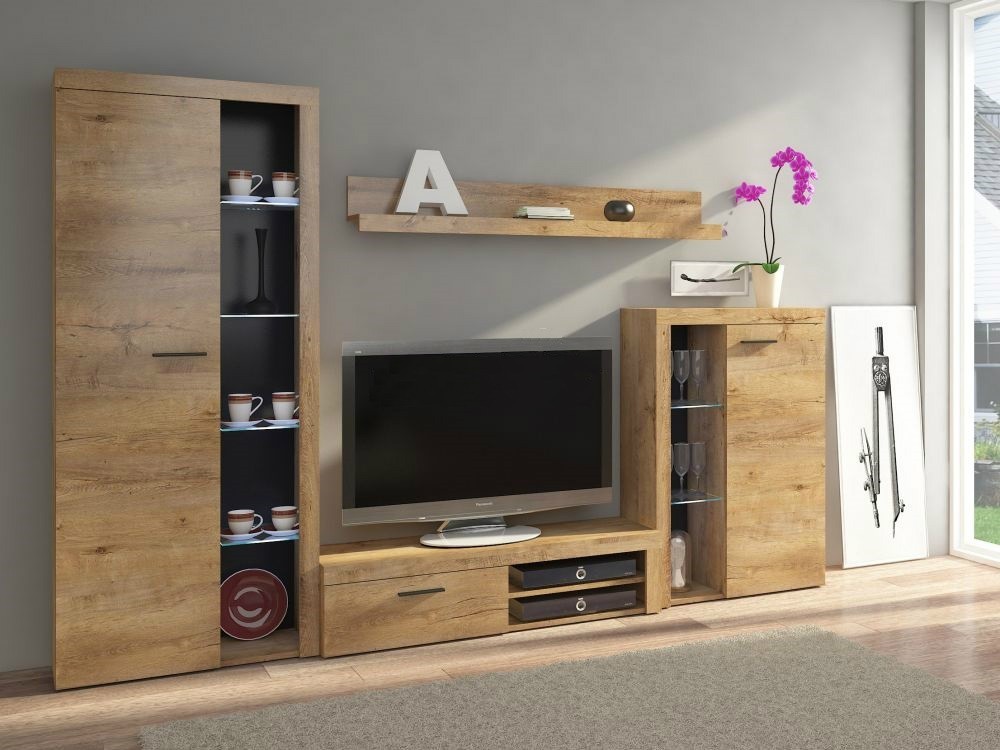 Obývací stěna Rumbaso je vyrobená z kvalitního lamina v provedení dub lefkas. Stěna se skládá ze skříňě: šířka: 75 cm, hloubka: 34 cm, výška: 190 cm, TV stolku: šířka: 120 cm, hloubka: 43 cm, výška: 32 cm, vitríny: šířka: 75 cm, hloubka: 34 cm, výška: 117 cm, police: šířka: 140 cm, hloubka: 19 cm, výška: 21 cm. Doporučejeme dokoupení LED osvětlení. Dodávano v demontu. V nabídce ji naleznete i v jiném barevném provedení. možnost dokoupení komody.