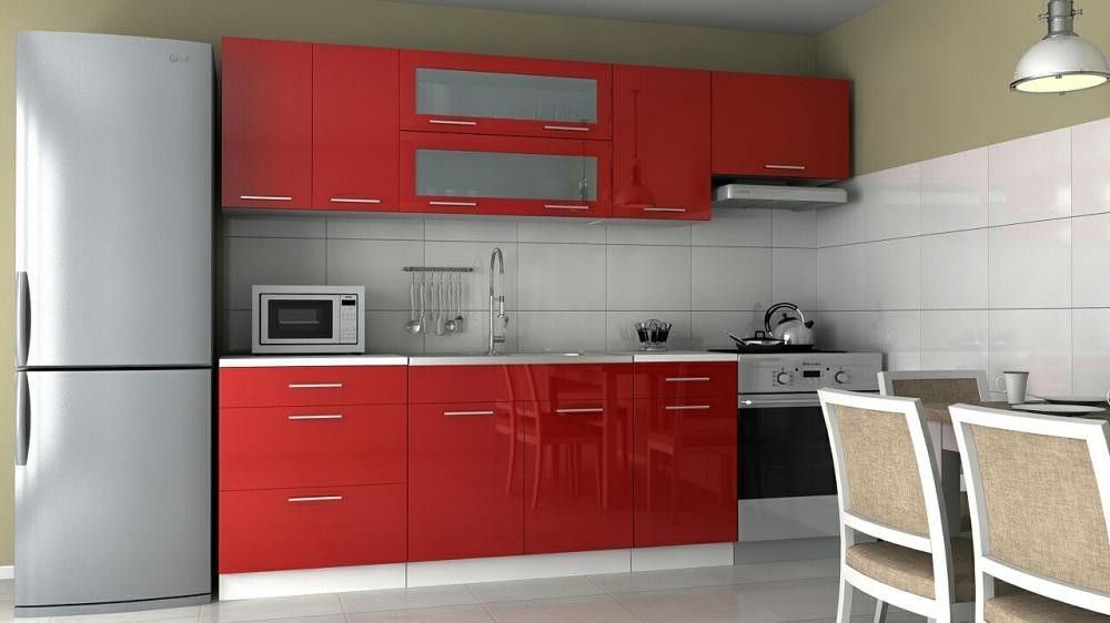 Moderní kuchyňská linka Diamond je v provedení vysokého lesku o celkovém rozměru 180 cm (spodní skříňky) / 240 cm (horní skříňky). Tato luxusní kuchyně je vhodná jak do panelákových bytů, tak do rodinných domů. Jednotlivé skříňky jsou vyrobeny tak, že si je můžete sestavit a seskládat libovolně. Součástí kuchyně je také pracovní deska ve velmi moderní a praktické barvě grafit a která je dodávána vcelku 100cm (nad dřezovou skříňku se pracovní deska nedodává). Sokl a korpusy skříněk jsou v bílé barvě. Úchyty jsou plastové v šedém barevném provedení. Skříňky jsou vyrobeny z foliované MDF ve vysokém lesku. Zboží je dodáváno bez vyobrazených dekorací, dřezu a spotřebičů.
