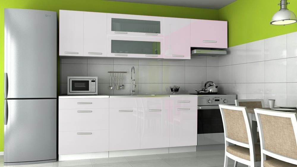 Moderní kuchyňská linka Diamond je v provedení vysokého lesku o celkovém rozměru 180 cm (spodní skříňky) / 240 cm (horní skříňky). Tato luxusní kuchyně je vhodná jak do panelákových bytů, tak do rodinných domů. Jednotlivé skříňky jsou vyrobeny tak, že si je můžete sestavit a seskládat libovolně. Součástí kuchyně je také pracovní deska ve velmi moderní a praktické barvě grafit a která je dodávána vcelku 100cm (nad dřezovou skříňku se pracovní deska nedodává). Sokl a korpusy skříněk jsou v bílé barvě. Úchyty jsou plastové v šedém barevném provedení. Skříňky jsou vyrobeny z foliované MDF ve vysokém lesku. Zboží je dodáváno bez vyobrazených dekorací, dřezu a spotřebičů.