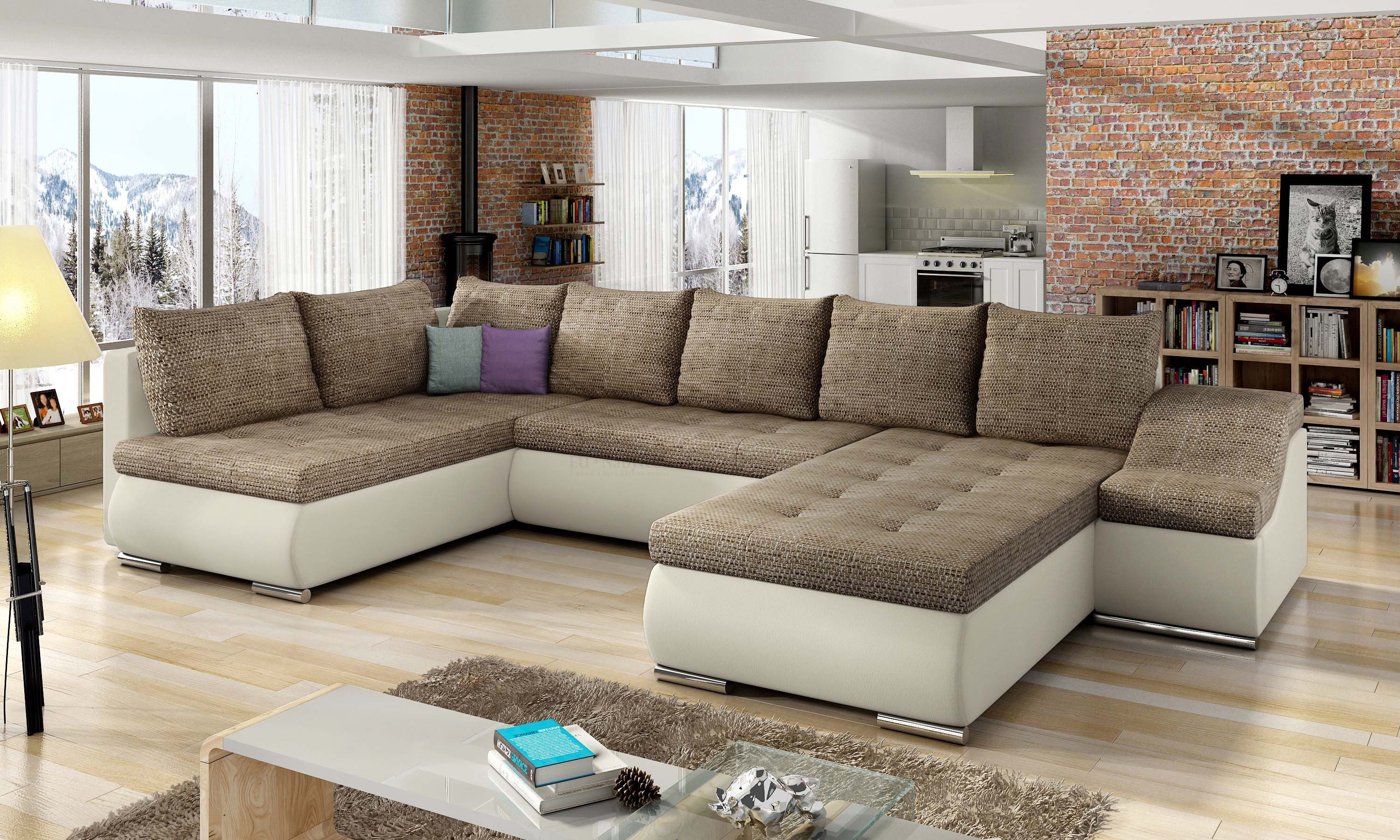 Netradiční prostorná sedačka TORONTO U s úložným prostorem a rozkladem pro příležitostné spaní. Po rozložení vzniká plocha na spaní 295 x 120 cm. Sedací plocha je vyplněna PUR pěnou a pružinami Faliste, kostra sedačky je v kombinaci masivního dřeva a dřevotřísky Barevné provedení - béžová ekokůže a melírovaná látka v barvě cappucino Berlin 03. Dodávano v demontu, 4 ks. Na hlavním obrázku je pravý roh.