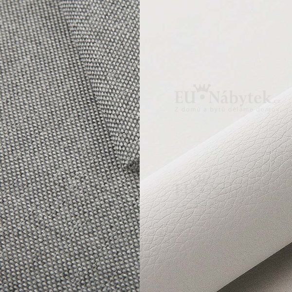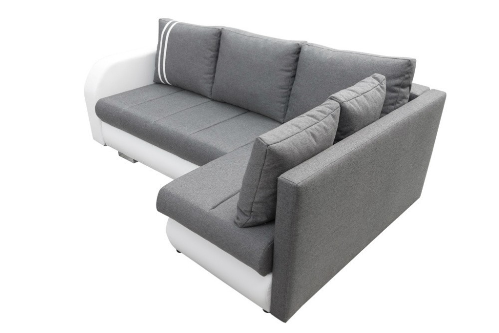 Moderní rohová sedací souprava, rozkládací a s praktickým úložným prostorem. Vhodná do všech moderních interiérů. Uvnitř sedací soupravy jsou vlnité pružin. Nožky - chrom. Jednoduchým rozkladem pomocí automatu vznikne lůžko vhodné k příležitostnému spaní. Plocha pro spaní 203x145 cm. Polštáře jsou v ceně. Jedná se o kombinaci světle šedé látky Inari 91 a bílé ekokůže Soft 17.