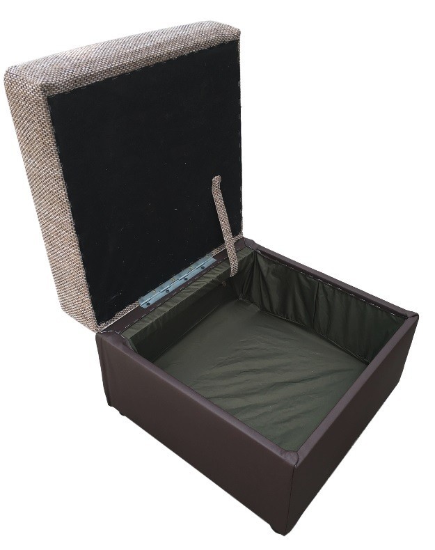 Praktický celočalouněný taburet s úložným prostorem. Rozměry jsou 50x50x37cm. Pohodlné sezení zaručuje kvalitní PUR pěna. Vhodný k sedacím soupravám Rihana nebo Timo. Taburet je čalouněný látkou Berlin 03 a ekokůží Madryt 128.