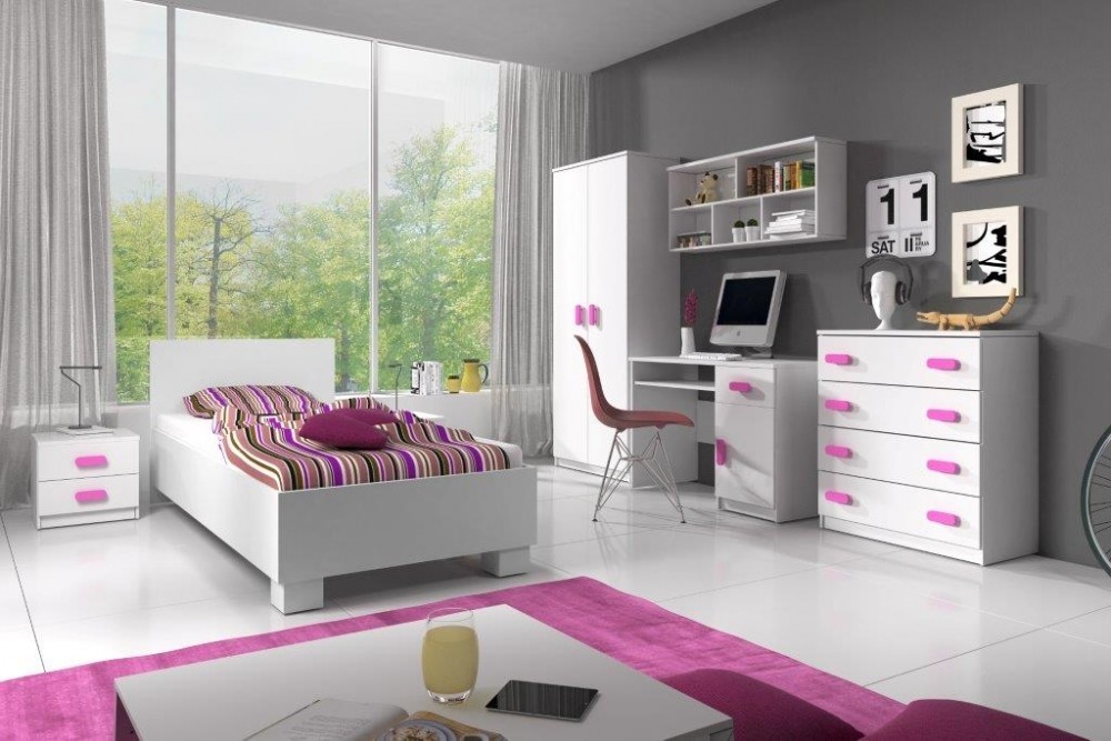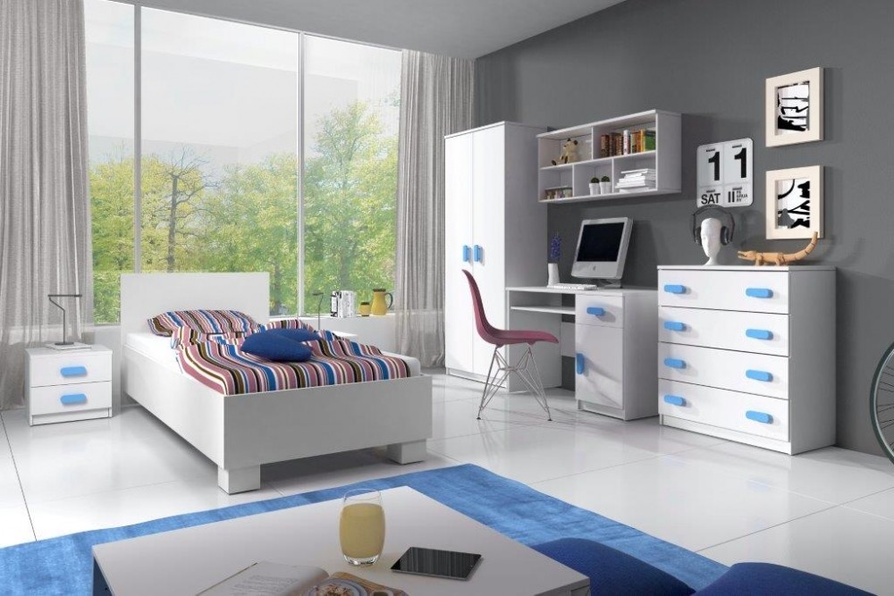 Dětský pokoj CMYK se skládá z komody S02 (80 x 93 x 40 cm), postele S36 (94 x 70 x 205 cm), šatní skříně S06 (80 x 193 x 50 cm), pracovního stolu S08 (110 x 76 x 50 cm), nočního stolku S22 (55 x 51 x 44 cm) a police 09 (110 x 50 x 23 cm). Korpus je v bílém provedení, barva úchytů je modrá ve dřevě. Nábytek této řady se hodí do dětského pokoje. Vyroben je z kvalitního lamina 16mm + 22mm, které je odolné proti poškrábání, poškození, vlhkosti a vysokým teplotám. Hrany jsou lemovány ABS páskou. Matraci i rošt je potřeba dokoupit. Dodávano v demontu. Níže na stránce naleznete další barevné varianty.