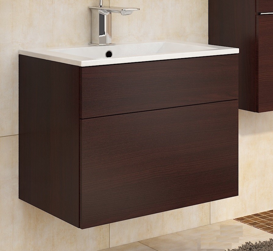 Elegantní koupelnová sestava vyrobená z kvalitního lamina a MDF. Korpusy (LTD) i dvířka (MDF) jsou v barvě wenge. Sestava se skládá ze 5 dílů - skříňka pod umyvadlo (60x47x45 cm), umyvadlo (61x14x45), 2x závěsná skříňka (30x110x31 cm) a zrcadla (60x65x17 cm). Skříňky se uchytávají na stěnu. Dodáváno v demontu.