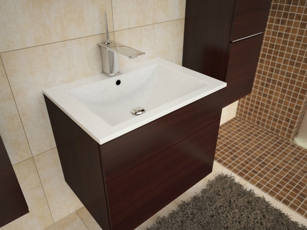 Elegantní koupelnová sestava vyrobená z kvalitního lamina a MDF. Korpusy (LTD) i dvířka (MDF) jsou v barvě wenge. Sestava se skládá ze 5 dílů - skříňka pod umyvadlo (60x47x45 cm), umyvadlo (61x14x45), 2x závěsná skříňka (30x110x31 cm) a zrcadla (60x65x17 cm). Skříňky se uchytávají na stěnu. Dodáváno v demontu.