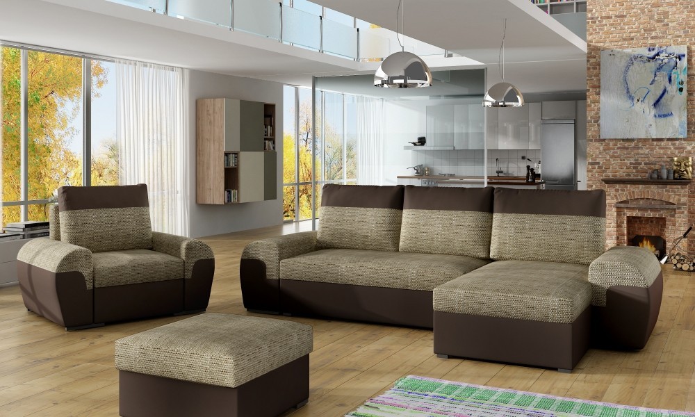 Praktická rozkládací rohová sedačka DORI+křeslo+taburet, které zapadne do každého interiéru. Sedačka je univerzální, roh lze smontovat na pravý i levý. Sedací souprava DORI díky vysokoelastické PUR pěně poskytuje pohodlné sezení. Po rozložení vznikne plocha pro příležitostné spaní 113x203cm. Sedačka a taburet obsahují praktické úložné prostory. Získáte tak spoustu místa pro uložení potřebných věcí. Potahy polštářů jsou na zip a díky tomu snímatelné. Potahová látka Sawana 16 a Sawana 22. V nabídce i v jiném barevném provedení.
