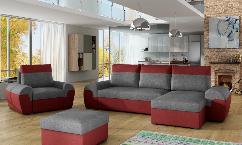 Praktická rozkládací rohová sedačka DORI+křeslo+taburet, které zapadne do každého interiéru. Sedačka je univerzální, roh lze smontovat na pravý i levý. Sedací souprava DORI díky vysokoelastické PUR pěně poskytuje pohodlné sezení. Po rozložení vznikne plocha pro příležitostné spaní 113x203cm. Sedačka a taburet obsahují praktické úložné prostory. Získáte tak spoustu místa pro uložení potřebných věcí. Potahy polštářů jsou na zip a díky tomu snímatelné. Potahová látka Berlin 02 a ekokůže Madryt 120. V nabídce i v jiném barevném provedení.