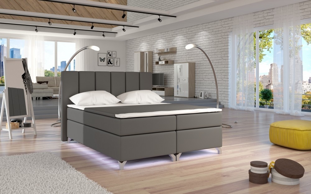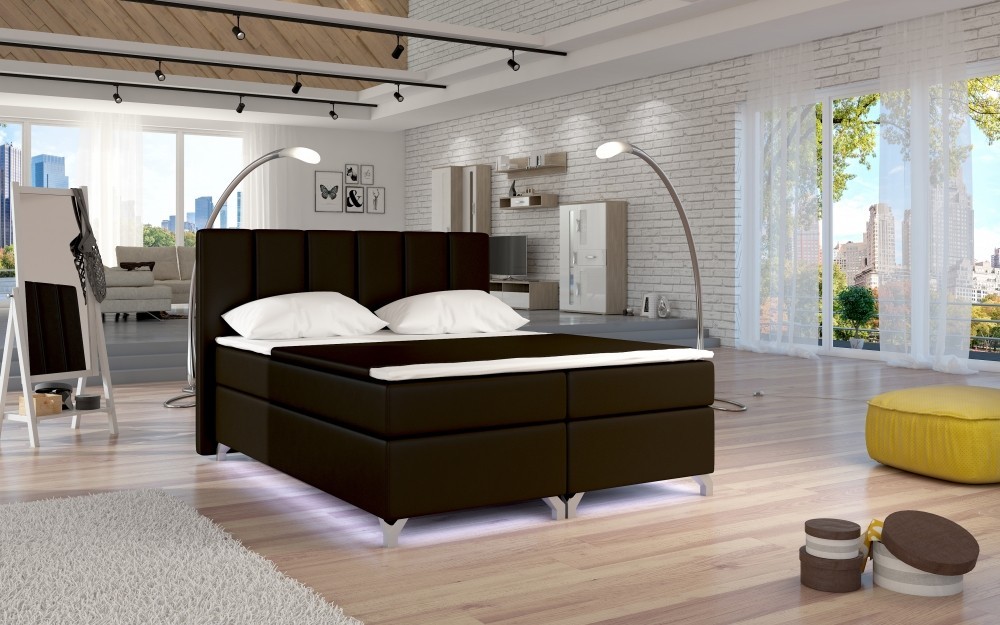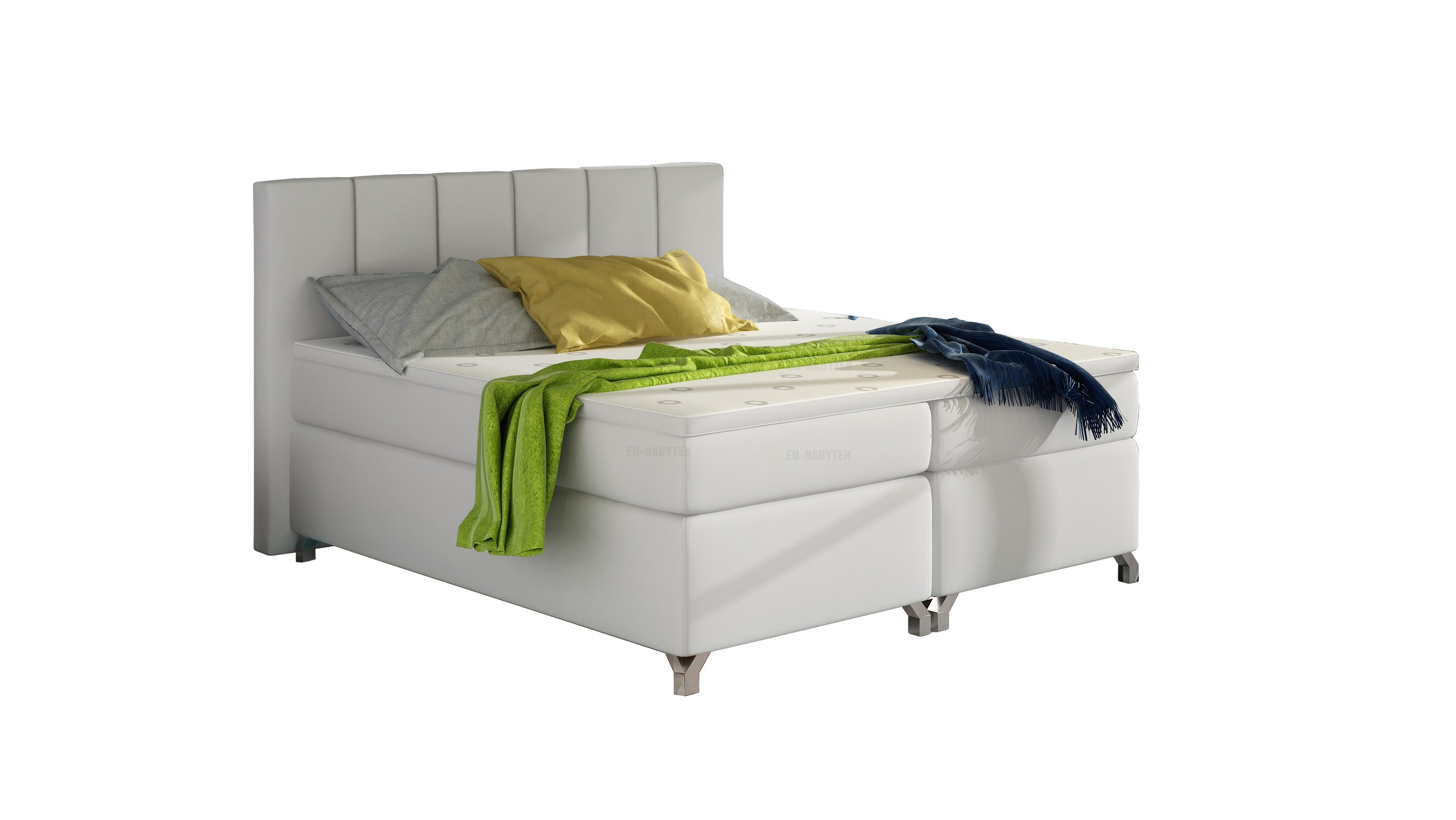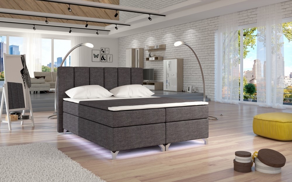 Kontinentální postel BOXSPRING vyniká svým jedinečným vzhledem. Boxspring je postelový systém, který můžete znát ze zahraničí či luxusních hotelů. Tato postel je nejen specifická svým vysokým násedem, ale hlavně díky svému složení odlišná od klasických postelí. Základním prvkem této postele Boxspring je spodní 20 cm devíti zónová pružinová matrace v rámu, která slouží jako prevence ortopedických vad páteře a ventilační podklad horní vyrovnávací tenké matrace - topperu. Toto spojení garantuje spokojenost jak z hlediska hygienického, tak i ortopedického a relaxačního. Postel obsahuje úložný prostor (viz fotogalerie). Dodávano v demontu. Možnost dokoupení LED osvětlení na této stránce níže. Tkanina Sawana 21.