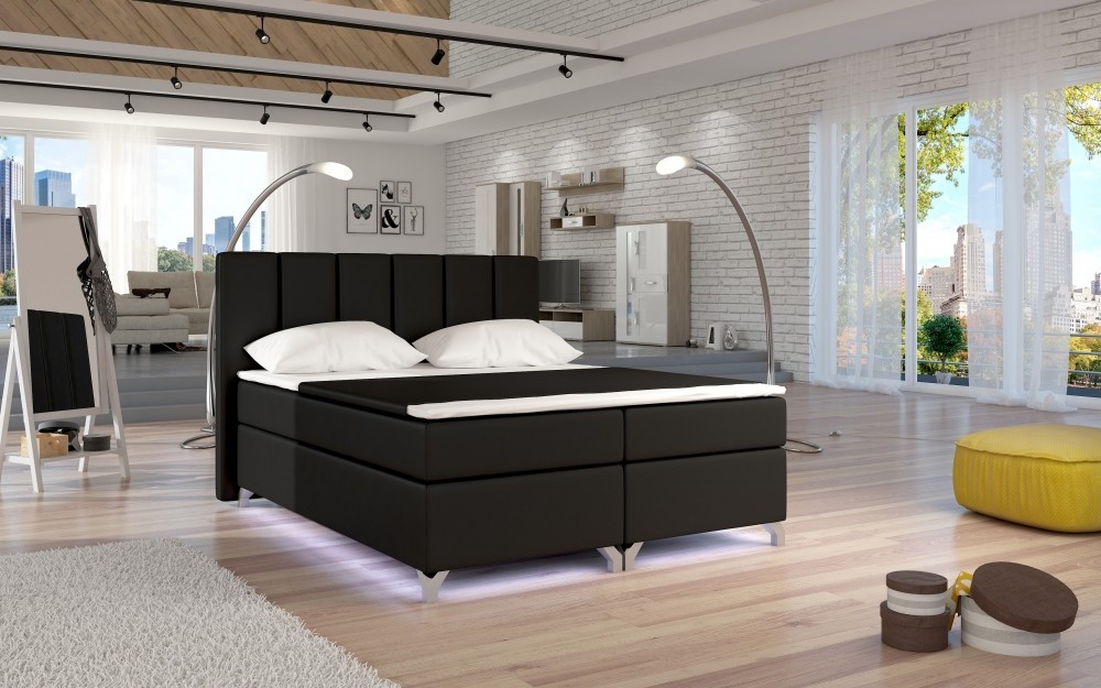 Kontinentální postel BOXSPRING vyniká svým jedinečným vzhledem. Boxspring je postelový systém, který můžete znát ze zahraničí či luxusních hotelů. Tato postel je nejen specifická svým vysokým násedem, ale hlavně díky svému složení odlišná od klasických postelí. Základním prvkem této postele Boxspring je spodní 20 cm devíti zónová pružinová matrace v rámu, která slouží jako prevence ortopedických vad páteře a ventilační podklad horní vyrovnávací tenké matrace - topperu. Toto spojení garantuje spokojenost jak z hlediska hygienického, tak i ortopedického a relaxačního. Postel obsahuje úložný prostor (viz fotogalerie). Dodávano v demontu. Možnost dokoupení LED osvětlení na této stránce níže. Ekokůže Soft 11.