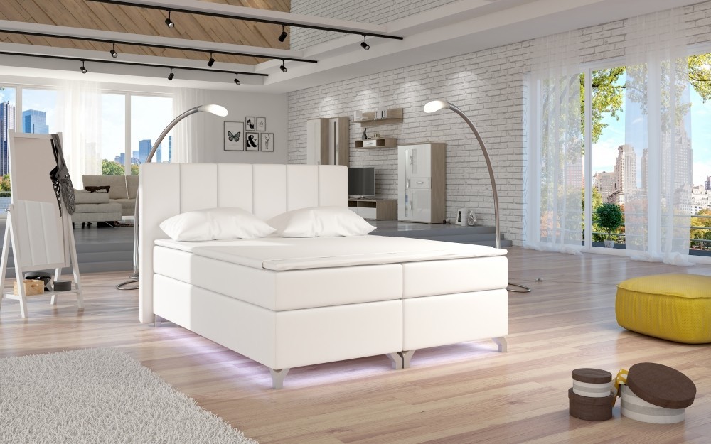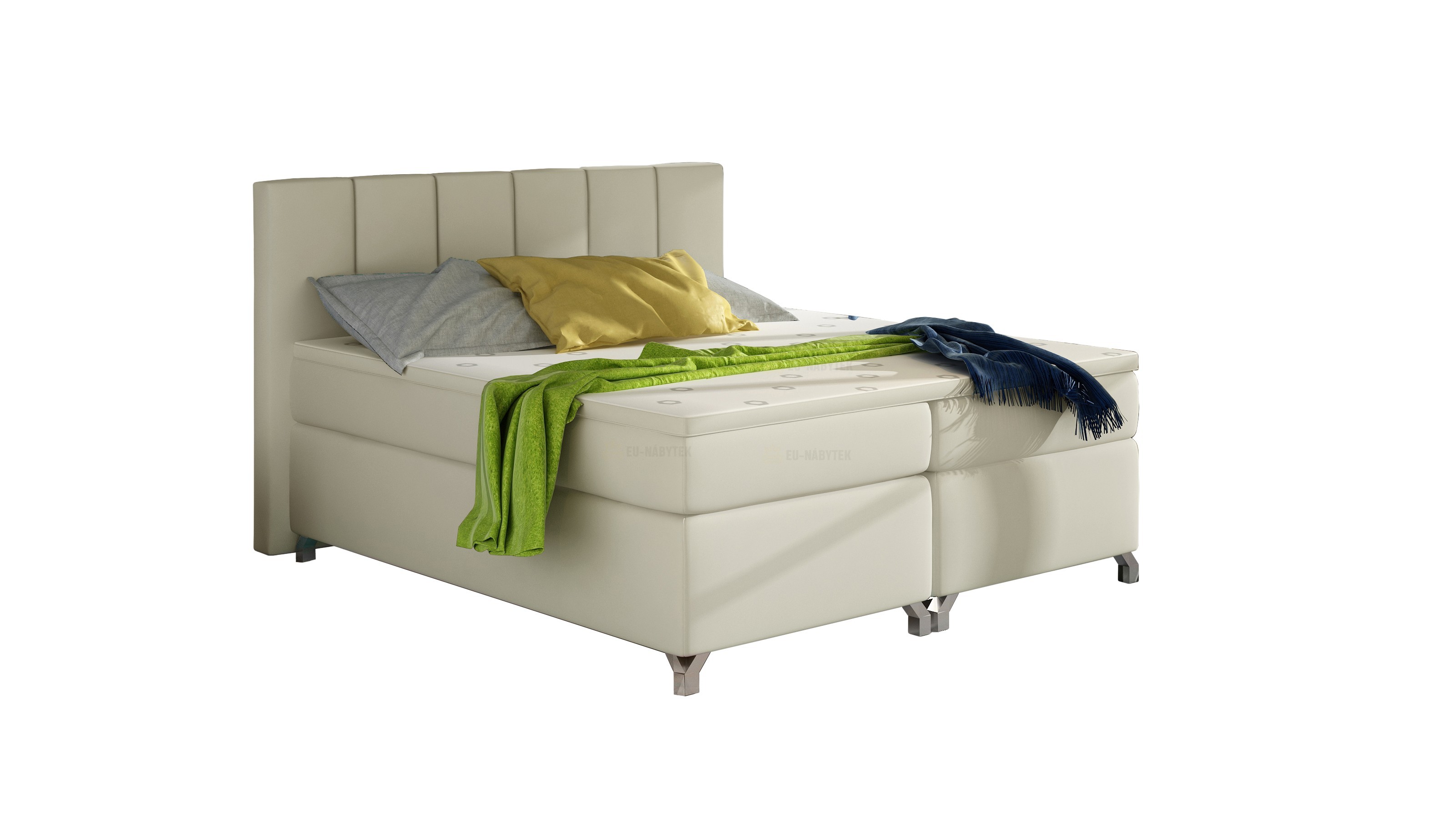 Kontinentální postel BOXSPRING vyniká svým jedinečným vzhledem. Boxspring je postelový systém, který můžete znát ze zahraničí či luxusních hotelů. Tato postel je nejen specifická svým vysokým násedem, ale hlavně díky svému složení odlišná od klasických postelí. Základním prvkem této postele Boxspring je spodní 20 cm devíti zónová pružinová matrace v rámu, která slouží jako prevence ortopedických vad páteře a ventilační podklad horní vyrovnávací tenké matrace - topperu. Toto spojení garantuje spokojenost jak z hlediska hygienického, tak i ortopedického a relaxačního. Postel obsahuje úložný prostor (viz fotogalerie). Dodávano v demontu. Možnost dokoupení LED osvětlení na této stránce níže. Ekokůže Soft 17.