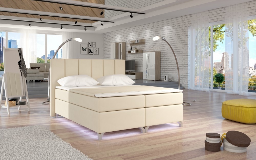 Kontinentální postel BOXSPRING vyniká svým jedinečným vzhledem. Boxspring je postelový systém, který můžete znát ze zahraničí či luxusních hotelů. Tato postel je nejen specifická svým vysokým násedem, ale hlavně díky svému složení odlišná od klasických postelí. Základním prvkem této postele Boxspring je spodní 20 cm devíti zónová pružinová matrace v rámu, která slouží jako prevence ortopedických vad páteře a ventilační podklad horní vyrovnávací tenké matrace - topperu. Toto spojení garantuje spokojenost jak z hlediska hygienického, tak i ortopedického a relaxačního. Postel obsahuje úložný prostor (viz fotogalerie). Dodávano v demontu. Možnost dokoupení LED osvětlení na této stránce níže. Tkanina Ekokůže 33.