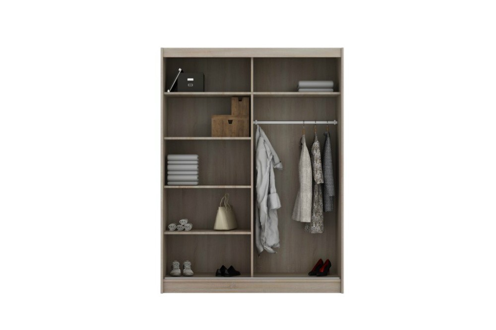 Šatní skříň s posuvnými dveřmi v moderním provedení. Korpus z kvalitního LTD je v barvě dub sonoma. Dveře jsou osazeny praktickým zrcadlem. Uspořádání polic viz. fotogalerie. Skříň má hliníkové pojezdy. Dodáváme v demontovaném stavu.