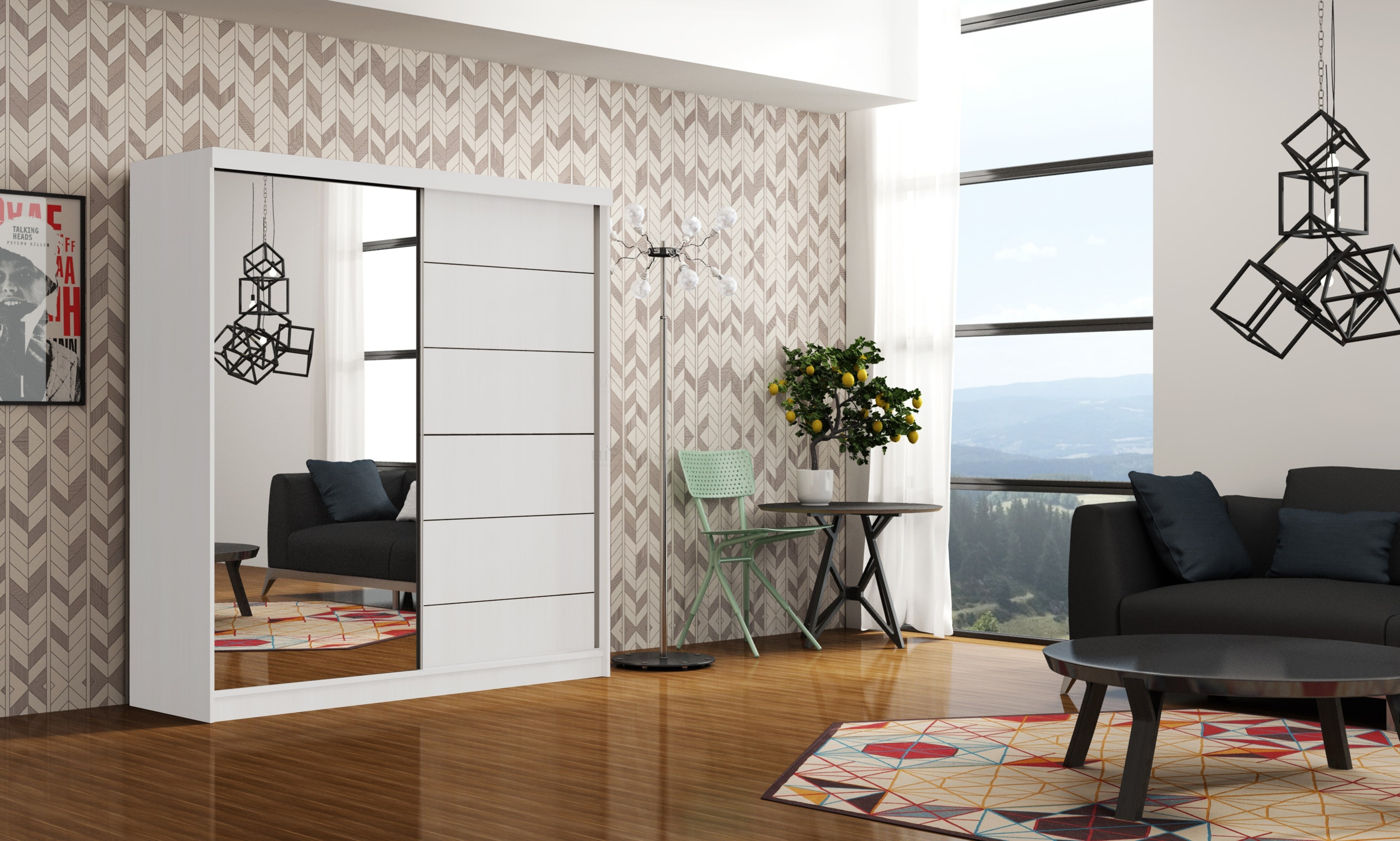 Šatní skříň s posuvnými dveřmi v moderním provedení. Korpus z kvalitního LTD je v barvě dub sonoma. Dveře jsou osazeny praktickým zrcadlem. Uspořádání polic viz. fotogalerie. Skříň má hliníkové pojezdy. Dodáváme v demontovaném stavu. Níže na stránce v dalším barevném provedení.