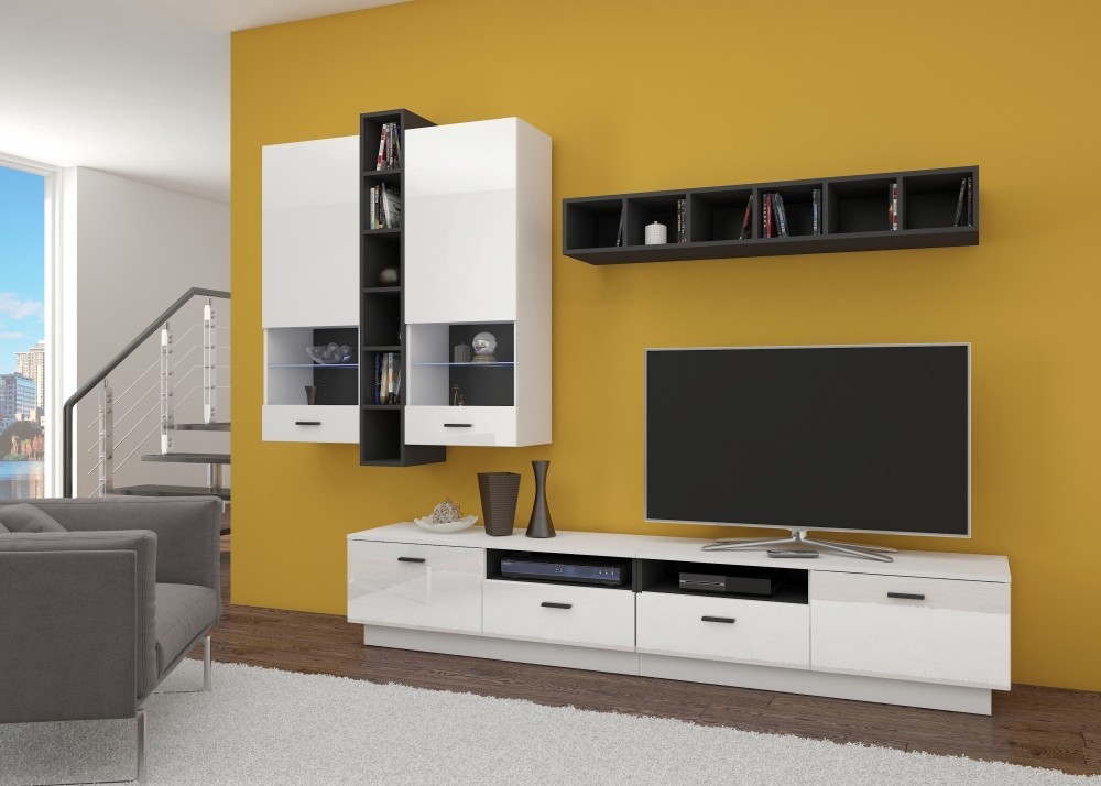 Obývací stěna je vyrobena z kvalitního lamina. Jednotlivé elementy lze ustavit zvlášt. K obývací stěně je možné dokoupit komodu ve stejném designu. Dodáváme v demontovaném stavu.