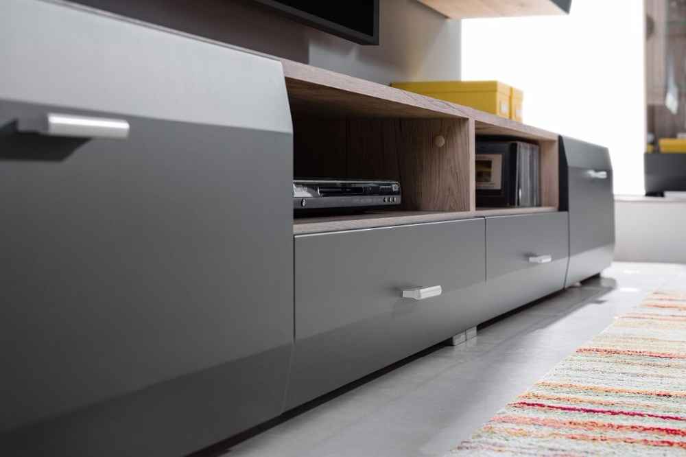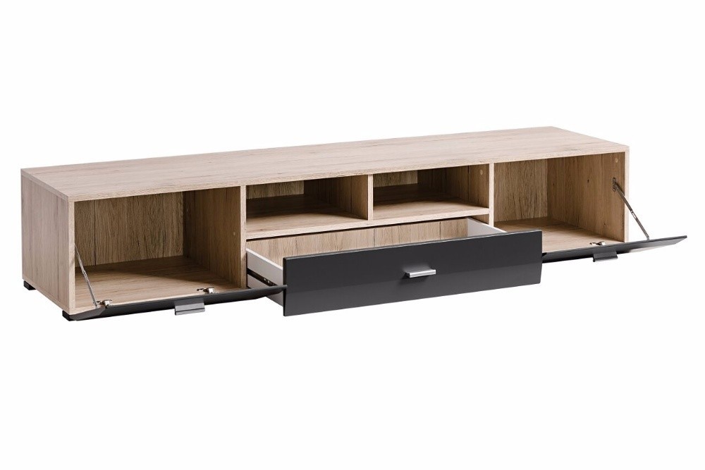 RTV stolek Cleopatra zdůrazňuje unikátní design nábytku. Stylová kompozice moderního nábytku zaručuje nejen reprezentativní zařízení daného interiéru, ale také i vysokou funkčnost, kterou ocení dokonce i nejnáročnější zákazníci. Spojení grafitové barvy s bílou barvou viditelnou na dvířkách obohatí užitnou plochu a zároveň rozzáří její celý prostor. Dodáváme v demontu.