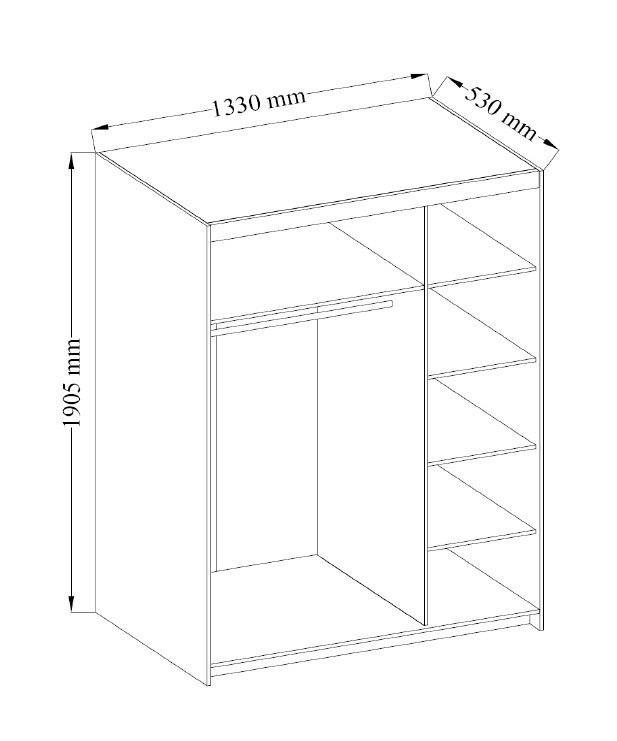 Šatní skříň Lena je velmi praktická a v moderním designu. Nábytek je vyrobený z lamina. Lamino je odolné proti poškrábání, poškození, vlhkosti a vysokým teplotám. Na pravé straně skříně jsou 4 police, nalevo je volný prostor se šatní tyčí a nad ní se nachází 1 police. Dodáváme v demontu.