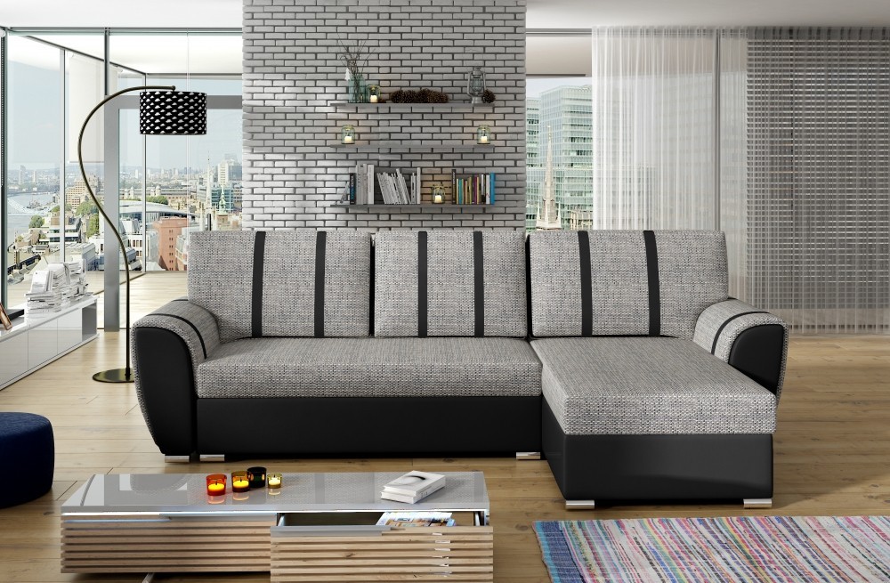 Praktická rozkládací rohová sedačka NAOMI, která disponuje dvěmi úložnými prostory. Naleznete je v prostřední části po rozložení a v bočním otomanu. Pohodlné sezení zaručují pružiny Faliste spolu s PUR pěnou T30. Spací plocha je 118x204cm. Sedačka zaujme především svým designem polštářů. Čalouněná je potahovou látkou Berlin 02 / ekokůže Madryt 1100. Výrobce ji však nabízí v několika dalších barevných kombinacích.
