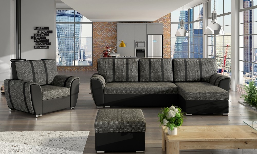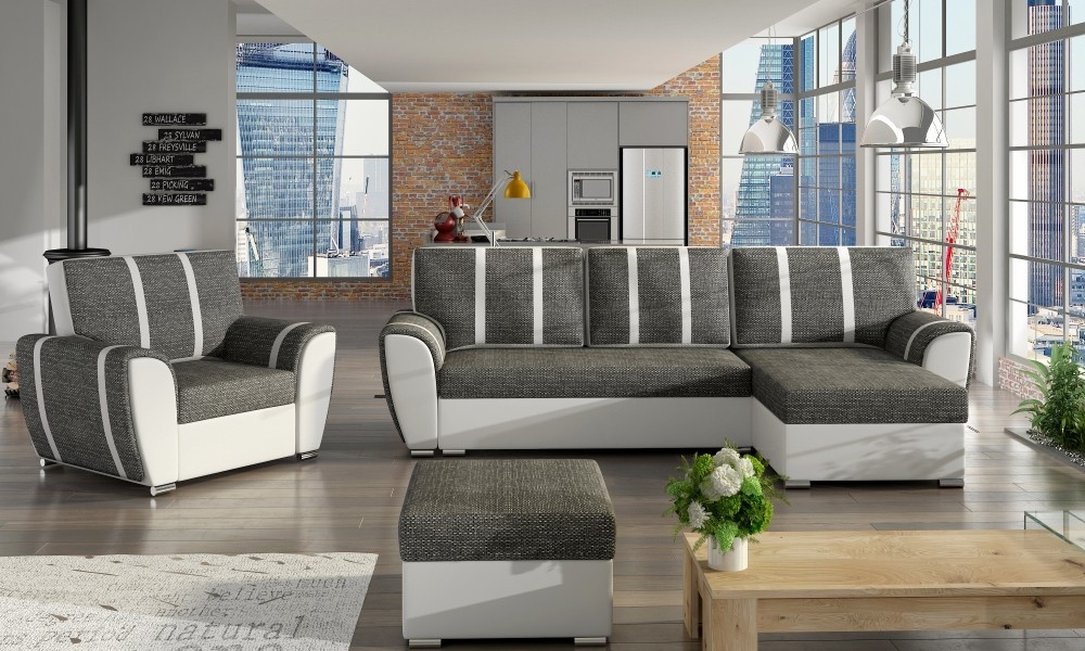 Praktická rozkládací sestava NAOMI, která disponuje spoustou úložného prostoru. Sestava se skládá z praktického křesla, taburetu a sedačky, která je univerzální. Roh lze tedy smontovat na pravou i levou stranu. Po rozložení vznikne plocha pro příležitostné spaní o rozměru 118 x 204 cm. Pohodlné sezení zaručují pružiny Faliste spolu s PUR pěnou T30. Čalouněná je potahovou látkou Berlin 02 a ekokůží Madryt 120. Výrobce ji však nabízí v několika dalších barevných kombinacích.