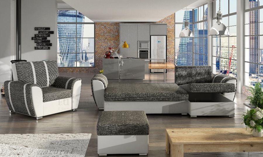 Praktická rozkládací sestava NAOMI, která disponuje spoustou úložného prostoru. Sestava se skládá z praktického křesla, taburetu a sedačky, která je univerzální. Roh lze tedy smontovat na pravou i levou stranu. Po rozložení vznikne plocha pro příležitostné spaní o rozměru 118 x 204 cm. Pohodlné sezení zaručují pružiny Faliste spolu s PUR pěnou T30. Čalouněná je potahovou látkou Berlin 02 a ekokůží Madryt 1100. Výrobce ji však nabízí v několika dalších barevných kombinacích.