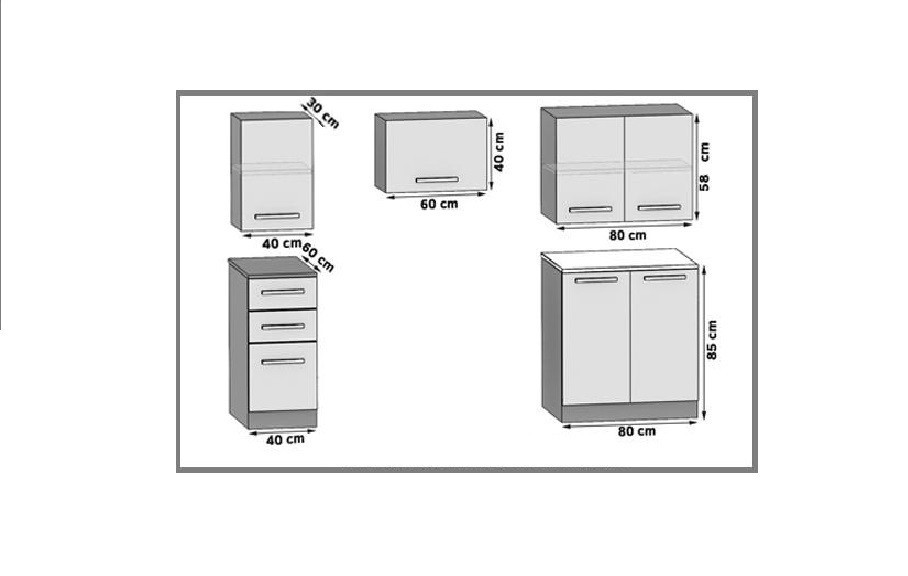 Kuchyňská linka NICCO je vyrobena z lamina v barevě bílá. Sestava se skládá ze spodních skříněk (ŠxVxH) - 40x85x45cm, dřezová 80x85x45cm. Horní - 80x58x30cm, digestořová 60x40x30cm, 40x58x30cm. Pracovní deska má (40 cm) a je v barvě šedé. Dodáváme v nesmontovaném stavu, bez dřezu a dekorací. Níže na stránce naleznete další barevní varianty.
