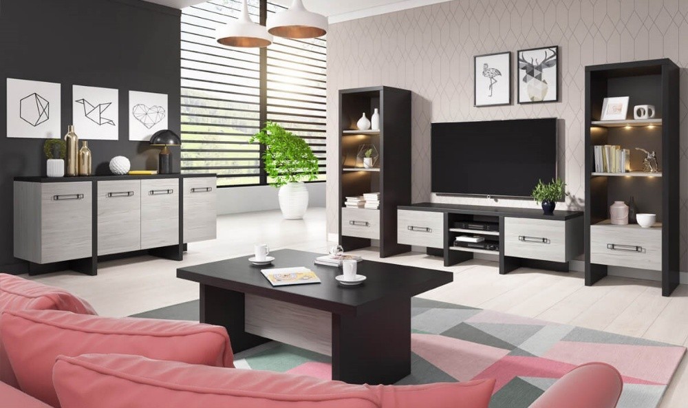 Obývací stěna Alena je velmi moderní, designově povedená řada nábytku, hodící se především do obývacích prostor. Je zde dostatek úložných prostor. Sestava se skládá z RTV stolku (150x45x50cm) a 2ks vitrín (50x160x50cm). LED osvětlení není v ceně. Dodávano v demontu.