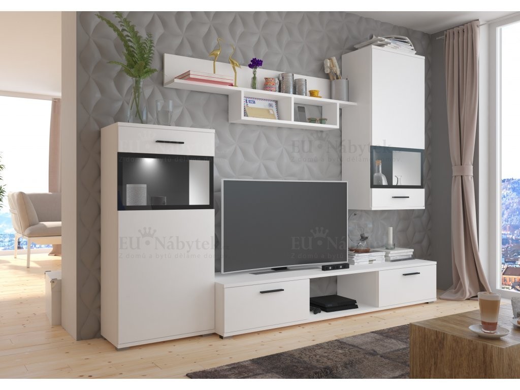 materiál: DTD laminovaná, materiál: DTD laminovaná, barevné provedení: bílá. K obývací stěně doporučujeme dokoupit LED osvětlení s modrým podbarvením. Dodáváno v demontu. Rozměry jednotlivých komponentů: