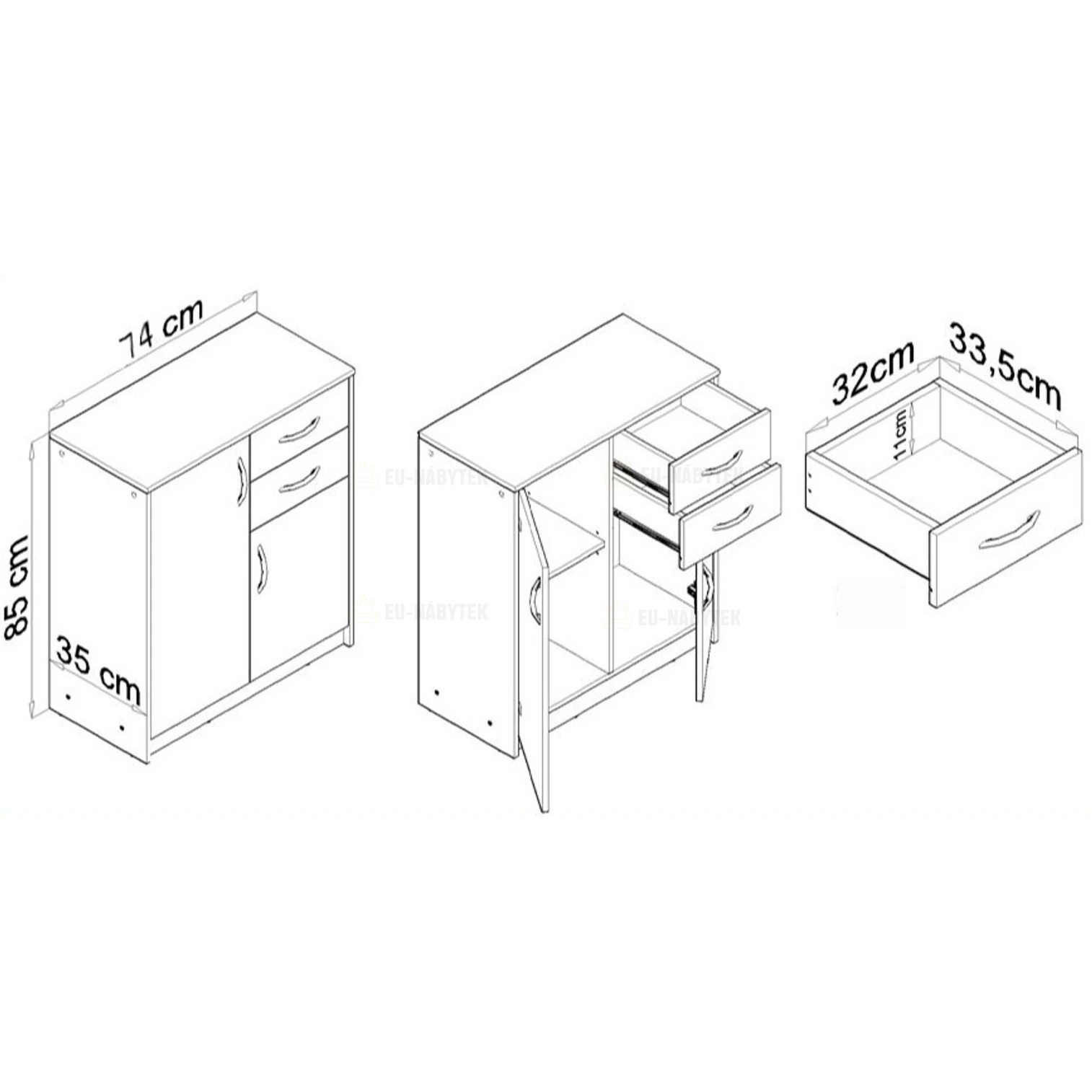 Komoda JULIUS je vyrobena z kvalitní LTD. Skládá se ze dvou šuplíků a dvou skříněk. Úchyty jsou plastové ve stříbrné barvě. Rozměry komody jsou: výška 85cm, šířka 74cm, hloubka 35cm. Díky svému jednoduchému stylu se bude hodit do každé místnosti. V nabídce naleznete ve více barvách. Dodáváno v demontu.